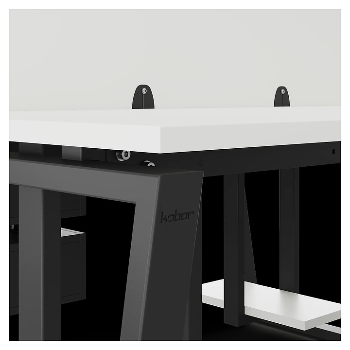 Офисный стол Кобор OTR/2-160/160 black/premium на 2 рабочих места используется в офисных помещениях и кабинетах руководителей. Модель оснащена опорами в форме обратной трапеции. Каркас и опоры выполнены из металла, выкрашенного в цвет черный муар (RAL9005), столешница – из ламинированной древесно-стружечной плиты (ЛДСП) цвета белый премиум (W1000 ST9). Дополнительные характеристики: