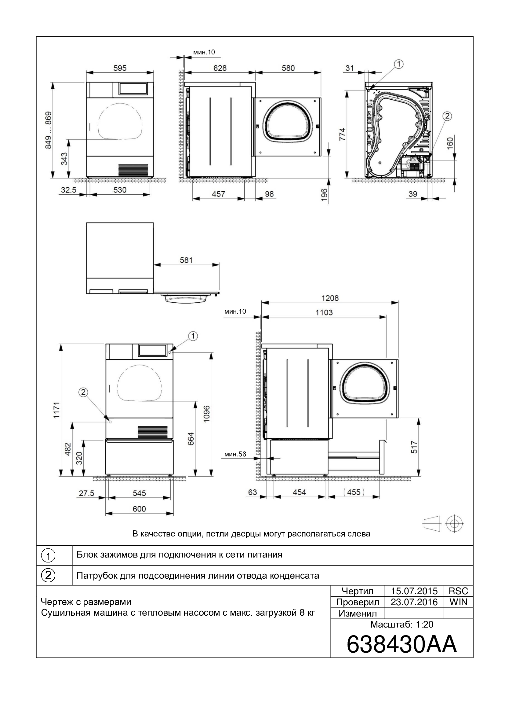 - Глубина с открытой под прямым углом дверью: 1220 мм