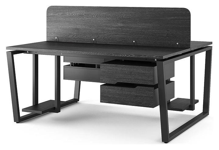 Офисный стол Кобор OTR/2-100/140 black/glazed на 2 рабочих места используется в офисных помещениях и кабинетах руководителей. Модель оснащена опорами в форме обратной трапеции. Каркас и опоры выполнены из металла, выкрашенного в цвет черный муар (RAL9005), столешница – из ламинированной древесно-стружечной плиты (ЛДСП) цвета черный дуб (H3178 ST37). Дополнительные характеристики: