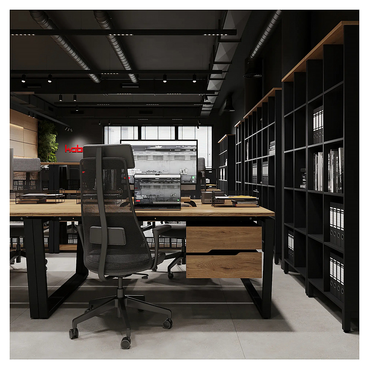 Офисный стол Кобор OTR/2-100/120 black/natural на 2 рабочих места используется в офисных помещениях и кабинетах руководителей. Модель оснащена опорами в форме обратной трапеции. Каркас и опоры выполнены из металла, выкрашенного в цвет черный муар (RAL9005), столешница – из ламинированной древесно-стружечной плиты (ЛДСП) цвета натуральный дуб (H1180 ST37). Дополнительные характеристики: