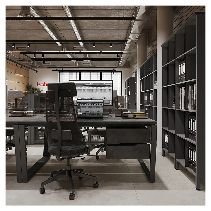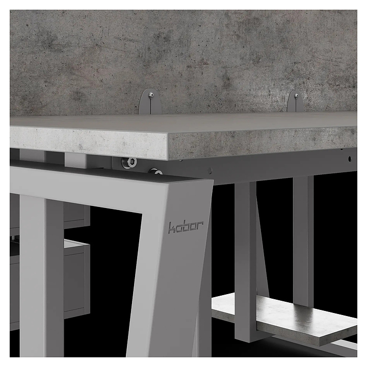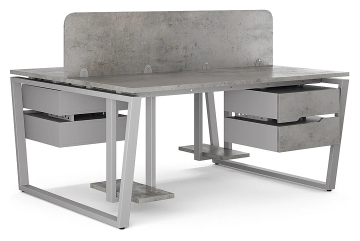 Офисный стол Кобор OTR/2-80/140 aluminum/chicago на 2 рабочих места используется в офисных помещениях и кабинетах руководителей. Модель оснащена опорами в форме обратной трапеции. Каркас и опоры выполнены из металла, выкрашенного в цвет алюминиевый металлик (RAL9006), столешница – из ламинированной древесно-стружечной плиты (ЛДСП) цвета бетон чикаго (F186 ST9). Дополнительные характеристики: