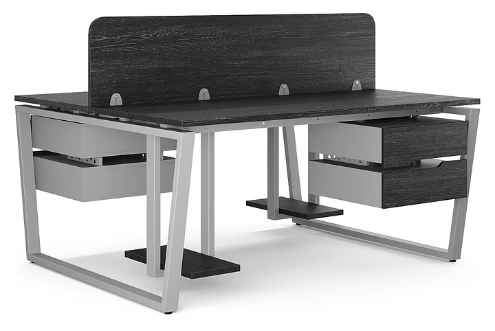 Офисный стол Кобор OTR/2-120/120 aluminum/glazed на 2 рабочих места используется в офисных помещениях и кабинетах руководителей. Модель оснащена опорами в форме обратной трапеции. Каркас и опоры выполнены из металла, выкрашенного в цвет алюминиевый металлик (RAL9006), столешница – из ламинированной древесно-стружечной плиты (ЛДСП) цвета черный дуб (H3178 ST37). Дополнительные характеристики: