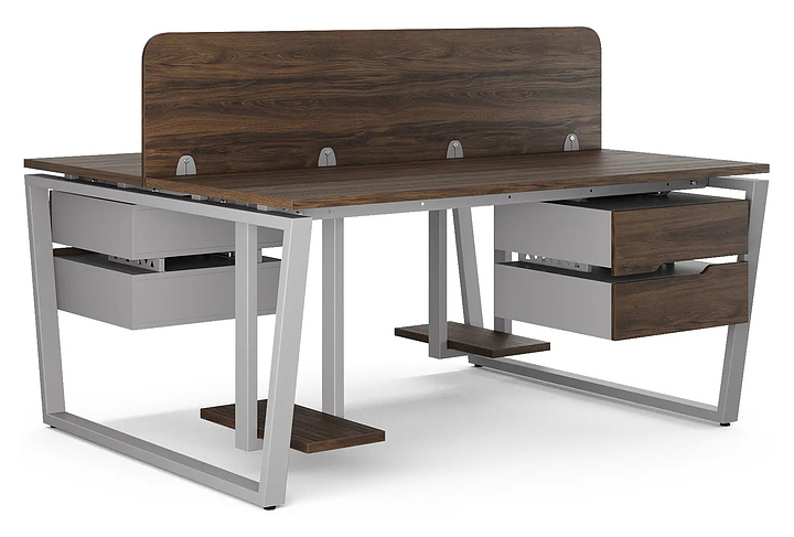 Офисный стол Кобор OTR/2-100/160 aluminum/charlston на 2 рабочих места используется в офисных помещениях и кабинетах руководителей. Модель оснащена опорами в форме обратной трапеции. Каркас и опоры выполнены из металла, выкрашенного в цвет алюминиевый металлик (RAL9006), столешница – из ламинированной древесно-стружечной плиты (ЛДСП) цвета дуб чарльстон (H3154 ST36). Дополнительные характеристики: