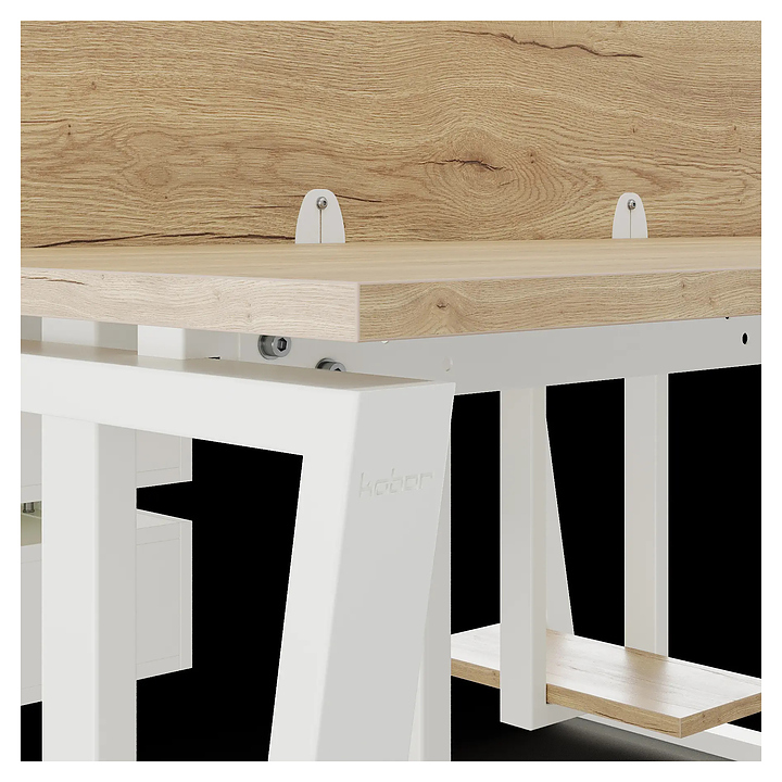 Офисный стол Кобор OTR/2-180/160 white/natural на 2 рабочих места используется в офисных помещениях и кабинетах руководителей. Модель оснащена опорами в форме обратной трапеции. Каркас и опоры выполнены из металла, выкрашенного в цвет белый муар (RAL9016), столешница – из ламинированной древесно-стружечной плиты (ЛДСП) цвета натуральный дуб (H1180 ST37). Дополнительные характеристики: