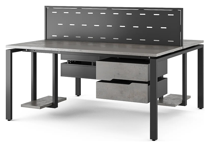 Офисный стол Кобор P/2-160/160 black/chicago на 2 рабочих места используется в офисных помещениях и кабинетах руководителей. Модель оснащена П-образными опорами. Каркас и опоры выполнены из металла, выкрашенного в цвет черный муар (RAL9005), столешница – из ламинированной древесно-стружечной плиты (ЛДСП) цвета бетон чикаго (F186 ST9). Дополнительные характеристики:
