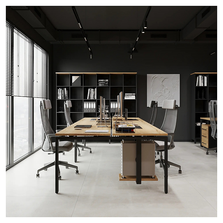Офисный стол Кобор P/2-120/140 black/natural на 2 рабочих места используется в офисных помещениях и кабинетах руководителей. Модель оснащена П-образными опорами. Каркас и опоры выполнены из металла, выкрашенного в цвет черный муар (RAL9005), столешница – из ламинированной древесно-стружечной плиты (ЛДСП) цвета натуральный дуб (H1180 ST37). Дополнительные характеристики: