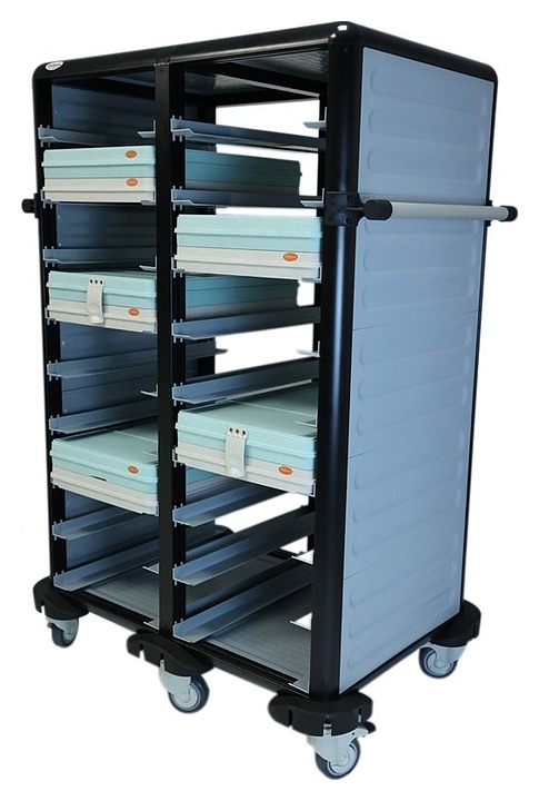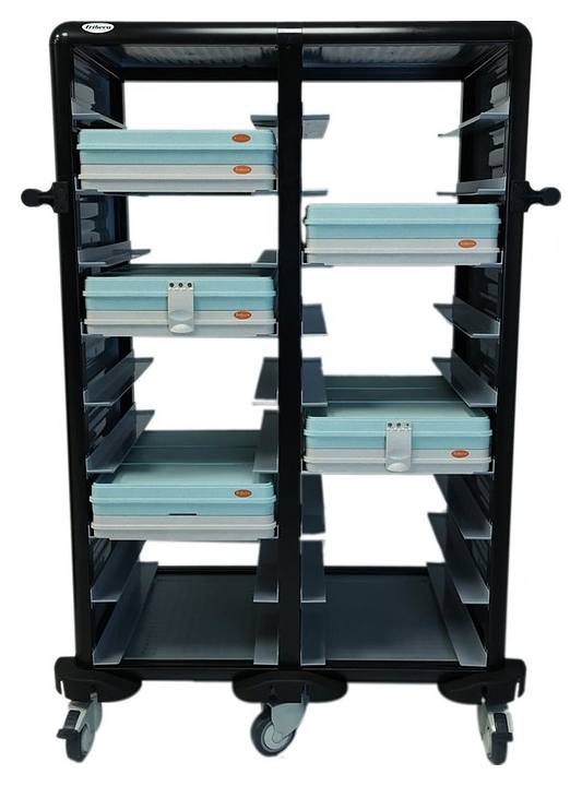 Тележка Tribeca 71х101х149 см предназначена для транспортировки термоподносов серии TT и аналогичных моделей на предприятиях общественного питания и торговли. Модель оснащена 2 отделениями по 9 ярусов направляющих в каждом, глухими боковыми, верхней и нижней панелями. Корпус выполнен из прочного пластика черного цвета. Особенности:
