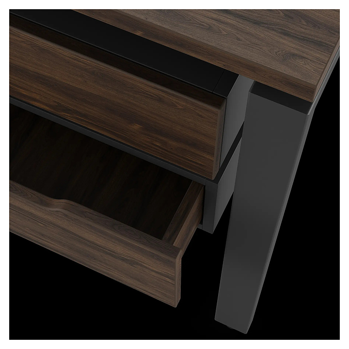 Офисный стол Кобор P/2-160/120 black/charlston на 2 рабочих места используется в офисных помещениях и кабинетах руководителей. Модель оснащена П-образными опорами. Каркас и опоры выполнены из металла, выкрашенного в цвет черный муар (RAL9005), столешница – из ламинированной древесно-стружечной плиты (ЛДСП) цвета дуб чарльстон (H3154 ST36). Дополнительные характеристики: