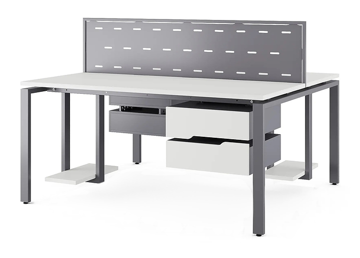 Офисный стол Кобор P/2-140/140 graphite/premium на 2 рабочих места используется в офисных помещениях и кабинетах руководителей. Модель оснащена П-образными опорами. Каркас и опоры выполнены из металла, выкрашенного в цвет графит муар (RAL7024), столешница – из ламинированной древесно-стружечной плиты (ЛДСП) цвета белый премиум (W1000 ST9). Дополнительные характеристики: