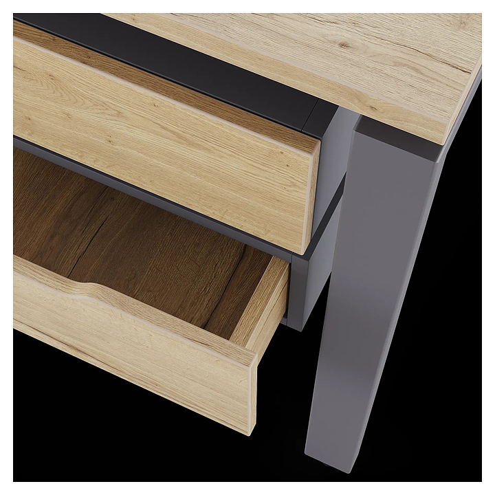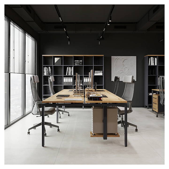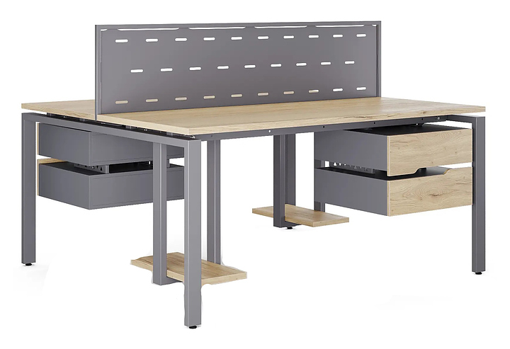 Офисный стол Кобор P/2-160/120 graphite/natural на 2 рабочих места используется в офисных помещениях и кабинетах руководителей. Модель оснащена П-образными опорами. Каркас и опоры выполнены из металла, выкрашенного в цвет графит муар (RAL7024), столешница из ламинированной древесно-стружечной плиты (ЛДСП) цвета дуб натуральный (H1180 ST37). Дополнительные характеристики: