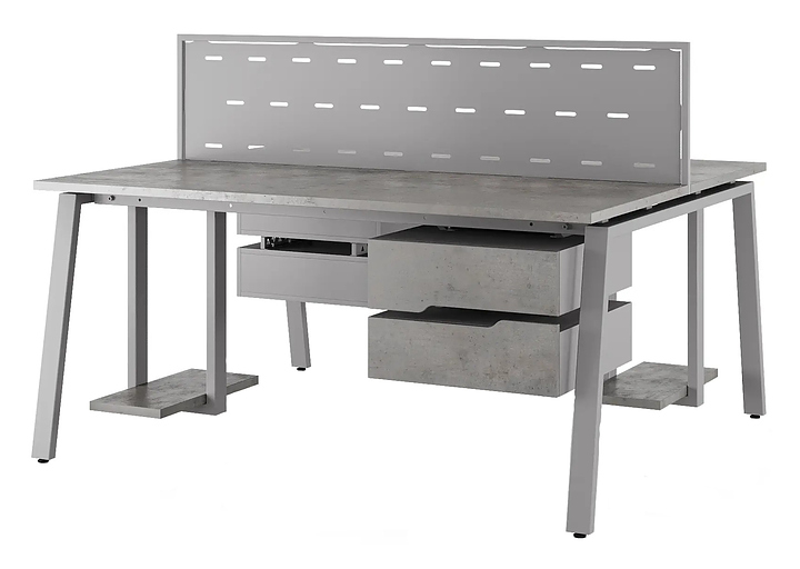 Офисный стол Кобор A/2-140/140 aluminum/chicago используется в офисных помещениях и кабинетах руководителей. Модель оснащена А-образными опорами. Каркас выполнен из металла, выкрашенного в цвет алюминиевый металлик (RAL9006), столешница – из ламинированной древесно-стружечной плиты (ЛДСП) цвета бетон чикаго (F186 ST9). Дополнительные характеристики: