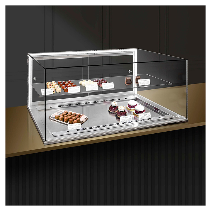 Встраиваемая горизонтальная витрина Finist Glassier G812-9/50/5 предназначена для кратковременного хранения и предпродажной демонстрации десертов, шоколадных изделий, конфет или пралине на предприятиях общественного питания и торговли. Модель оснащена 2 дверьми со стороны продавца, полкой, светодиодной подсветкой и может монтироваться в столешницу из любого материала. Купол витрины имеет большую площадь остекления, что помогает беспрепятственно разглядеть товар со всех сторон. Каркас и столешница выполнены из зеркальной нержавеющей стали, купол - из просветленного стекла, полка - из стекла и агрегатная часть - из крашеной стали. Особенности: