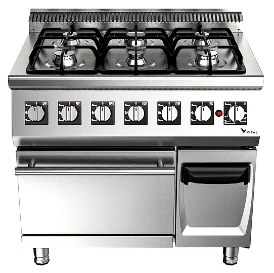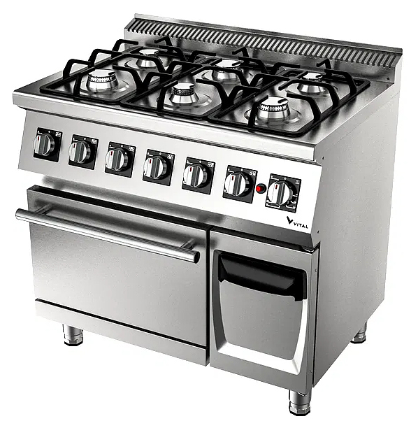 Газовая плита VITAL GKF6030 серии 600 предназначена для приготовления различных блюд из мяса, птицы, рыбы и овощей в наплитной посуде на предприятиях общественного питания и торговли. Модель оснащена 6 горелками, духовкой, устройством газовой безопасности и термопарой. Закругленные края плиты обеспечивают легкую чистку. Корпус выполнен из нержавеющей стали, съемная решетка и нижнее основание духовки - из чугуна. Особенности: