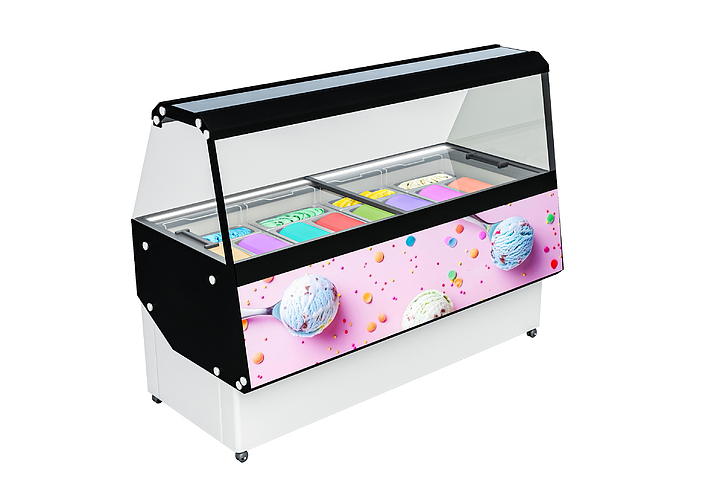 Витрина FRISMO Scooping-12 предназначена для демонстрации, охлаждения и долгосрочного хранения мягкого мороженого на предприятиях общественного питания и торговли. Модель оснащена LED-подсветкой внутренного объема и лайтбокса, цифровым контроллером, 3 корзинами и 4 поворотными колесами. Надстройка выполнена из закаленного стекла, ложементы - из нержавеющей стали. В комплект поставки входит скребок для чистки. Особенности: