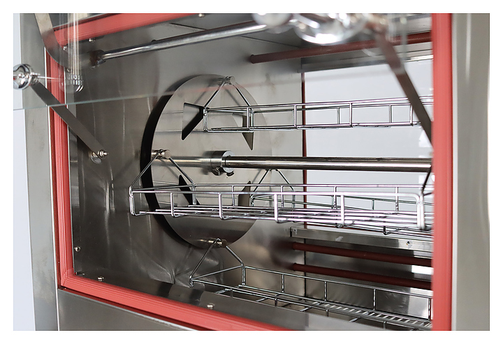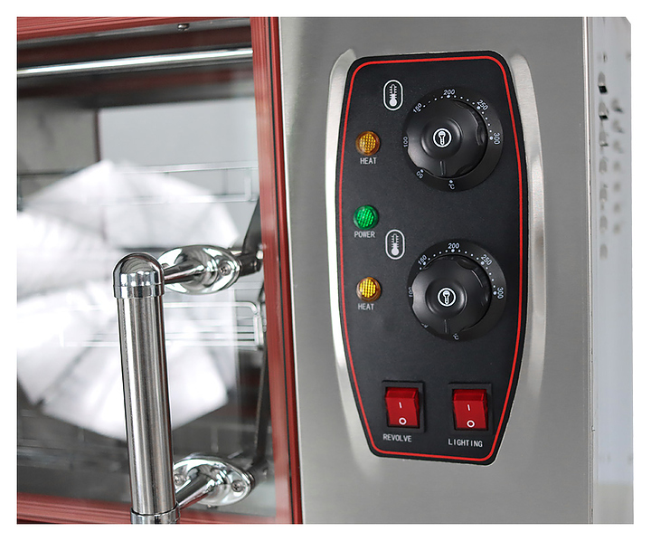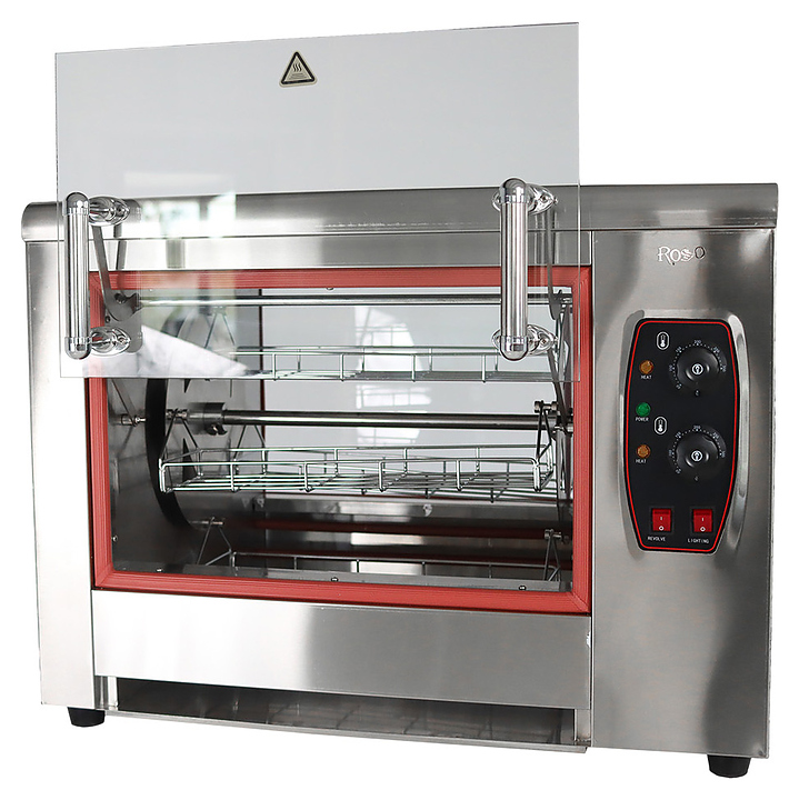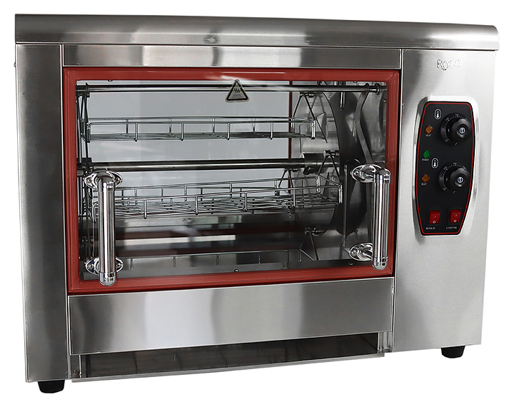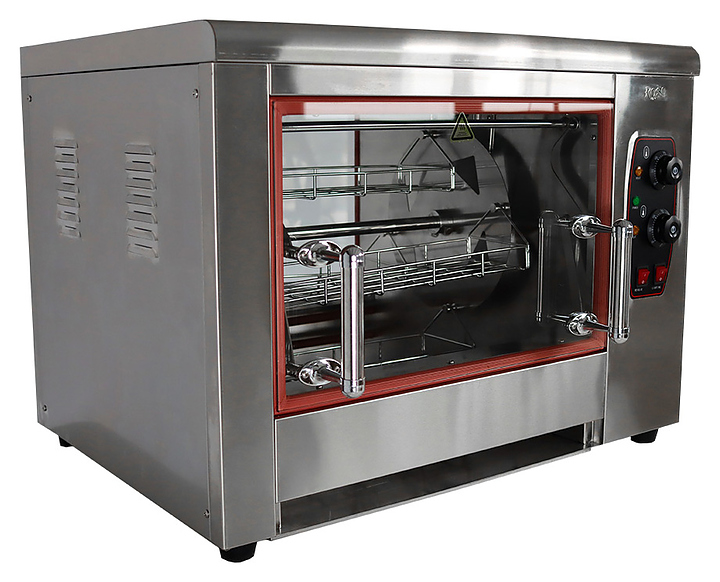 Гриль Rosso HEJ-266 предназначен для жарки домашней птицы целиком на предприятиях общественного питания и торговли. Модель оснащена электромеханической панелью управления справа, электронагревателями трубчатого типа (ТЭНами), светодиодными индикаторами питания и нагрева, выключаемой внутренней подсветкой колыбельного типа и устойчивыми нескользящими ножками. Корпус выполнен из нержавеющей стали, задняя стенка и дверцы - из термостойкого стекла. В комплект поставки входят 4 корзины для 8-12 цыплят, 12 крючков и съемный поддон для жира. Особенности: