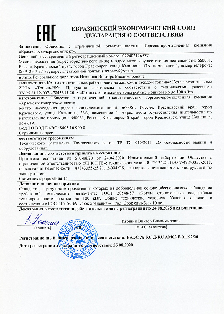 Российская компания Zota производит электрические котлы мощностного диапазона от 3 до 400 киловатт. Ассортимент включает 5 линеек твердотопливных и комбинированных котлов, электросауны, приборы КиП, ТЭНы любой мощности и конфигурации, автоматические твердотопливные котлы - пеллетные и угольные.