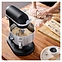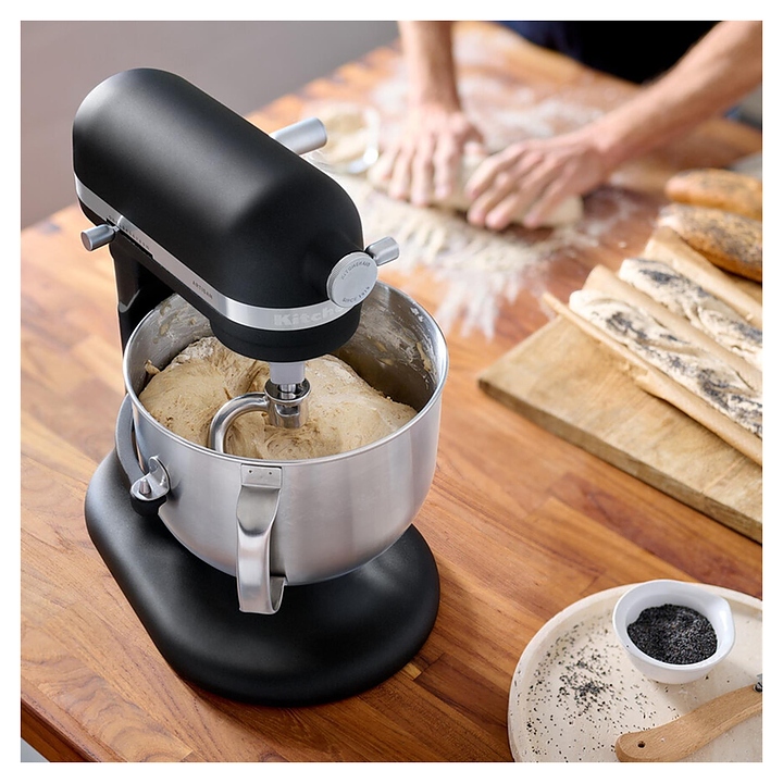 Настольный планетарный миксер KitchenAid Artisan 5KSM70SHXEBM серии Heavy Duty используется в домашних условиях для замеса теста различной консистенции, в том числе белкового, заварного, дрожжевого, бисквитного, а также приготовления пюре, кремов, муссов и соусов. Механизм вращения месильного органа аналогичен поступательно-вращательному движению планет, причем насадка вращается вдоль своей оси в противоположном направлении поступательному движению, таким образом ингредиенты тщательно перемешиваются в однородную массу. Модель оснащена электродвигателем переменного тока, механизмом подъема и опускания чаши с фиксирующими лапками, кабелем питания с вилкой и электромеханической панелью управления. Литой корпус обтекаемой формы выполнен из цинка с матовым покрытием износостойкой эмалью черного цвета и декоративной серебристой полосой с логотипом по периметру нижней части головки моторного блока, рычаги управления – из металла с полимерными рукоятками, чаша – из нержавеющей стали с серебристой полированной поверхностью, венчик, крюк и лопатка – из нержавеющей стали, лопатка с гибким ребром – из металла с антибактериальным полиэфирным покрытием с содержанием серебра, защитный обод – из пластика. Комплектация: