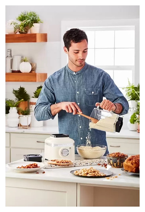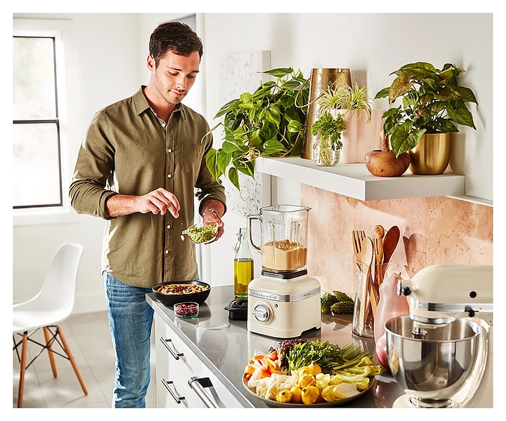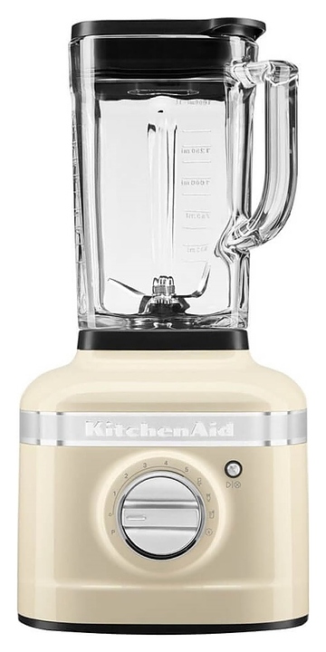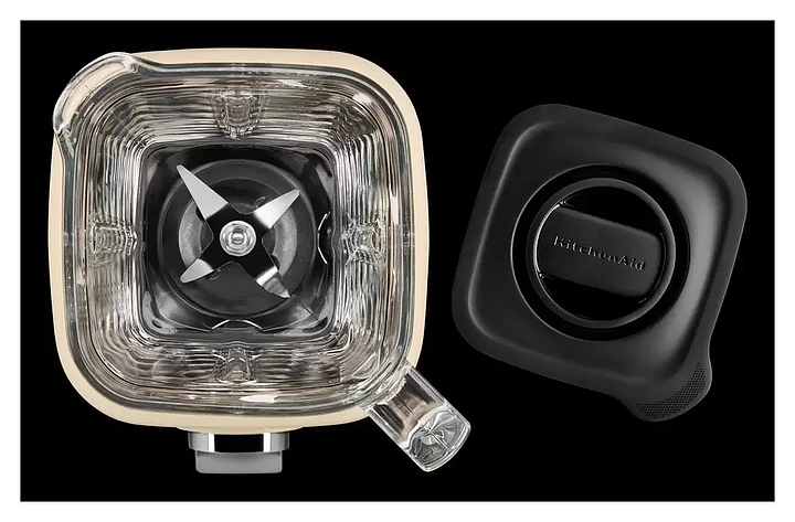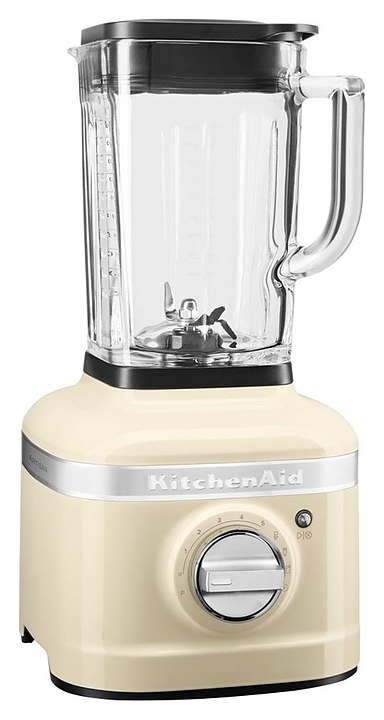 Стационарный блендер KitchenAid Artisan K400 5KSB4026EAC предназначен для измельчения пищевых продуктов и приготовления муссов, смузи, фраппе, соусов, коктейлей, фруктовых и овощных пюре в домашних условиях. Модель оснащена кабелем питания с вилкой и электромеханической панелью управления. Корпус квадратно ориентированной формы выполнен из металла методом литья под давлением с покрытием эмалью оттенка миндальный крем (Almond Cream) и декоративной серебристой полосой с логотипом по периметру верхней части, основание прибора и корпус ножевого узла – из черного пластика, кувшин – из стекла, крышки – из черного полимера, ножи – из высококачественной нержавеющей стали, переключатель с серебристой поверхностью.