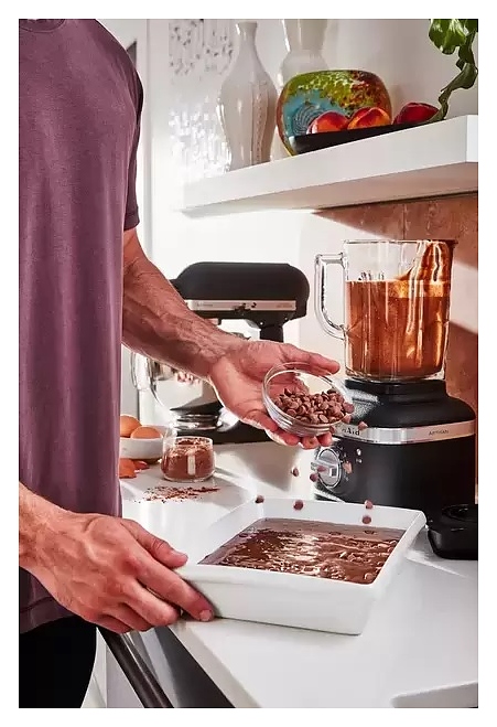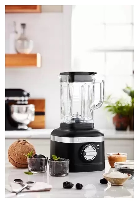 Стационарный блендер KitchenAid Artisan K400 5KSB4026EBK предназначен для измельчения пищевых продуктов и приготовления муссов, смузи, фраппе, соусов, коктейлей, фруктовых и овощных пюре в домашних условиях. Модель оснащена кабелем питания с вилкой и электромеханической панелью управления. Корпус квадратно ориентированной формы выполнен из металла методом литья под давлением с покрытием эмалью оттенка черный чугун (Cast Iron Black Edition) и декоративной серебристой полосой с логотипом по периметру верхней части, основание прибора и корпус ножевого узла – из черного пластика, кувшин – из стекла, крышки – из черного полимера, ножи – из высококачественной нержавеющей стали, переключатель с серебристой поверхностью.