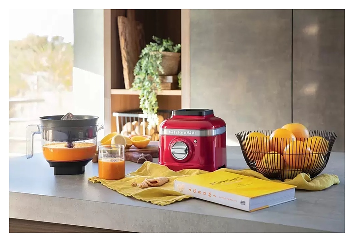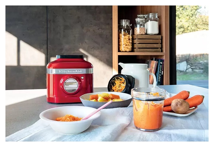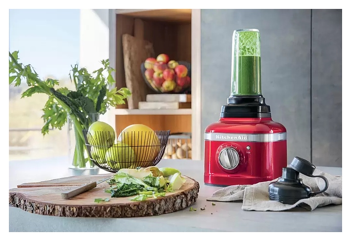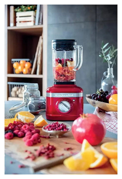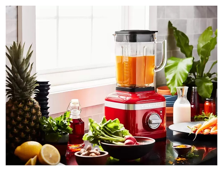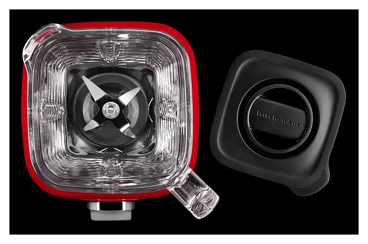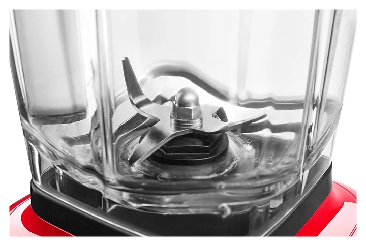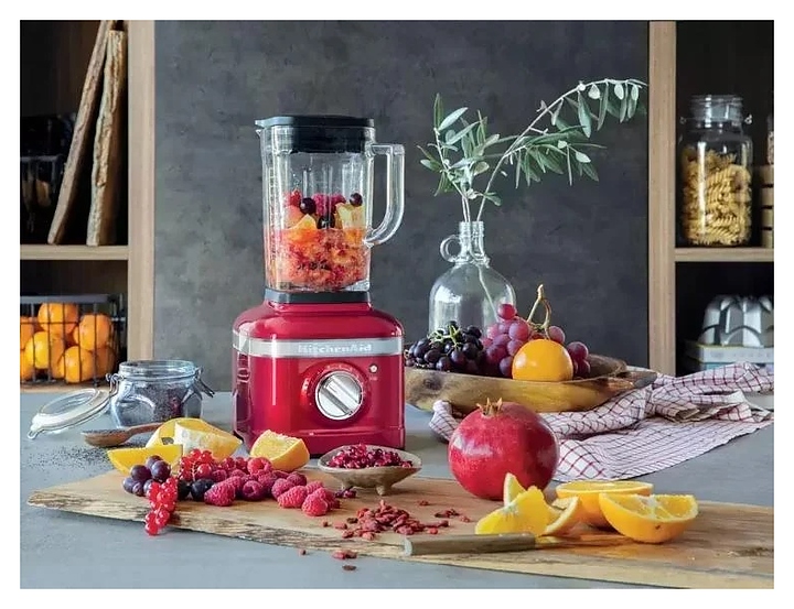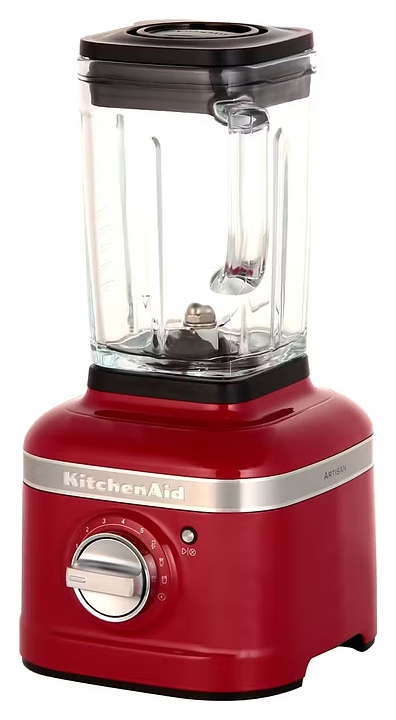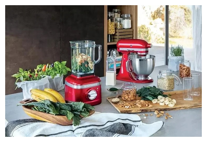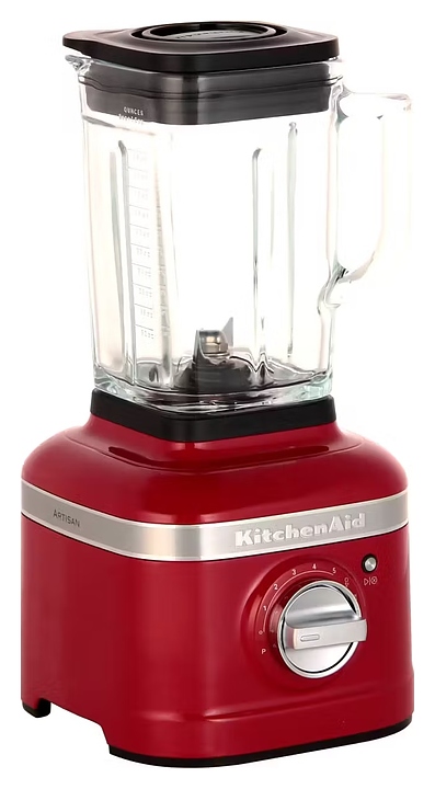 Стационарный блендер KitchenAid Artisan K400 5KSB4026ECA предназначен для измельчения пищевых продуктов и приготовления муссов, смузи, фраппе, соусов, коктейлей, фруктовых и овощных пюре в домашних условиях. Модель оснащена кабелем питания с вилкой и электромеханической панелью управления. Корпус квадратно ориентированной формы выполнен из металла методом литья под давлением с покрытием эмалью оттенка карамельное яблоко (Candy Apple) и декоративной серебристой полосой с логотипом по периметру верхней части, основание прибора и корпус ножевого узла – из черного пластика, кувшин – из стекла, крышки – из черного полимера, ножи – из высококачественной нержавеющей стали, переключатель с серебристой поверхностью.