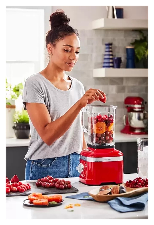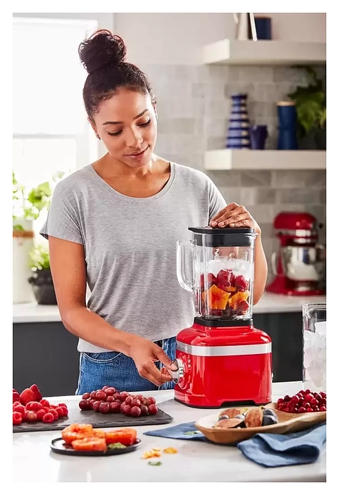 Стационарный блендер KitchenAid Artisan K400 5KSB4026EER предназначен для измельчения пищевых продуктов и приготовления муссов, смузи, фраппе, соусов, коктейлей, фруктовых и овощных пюре в домашних условиях. Модель оснащена кабелем питания с вилкой и электромеханической панелью управления. Корпус квадратно ориентированной формы выполнен из металла методом литья под давлением с покрытием эмалью оттенка имперский красный (Empire Red) и декоративной серебристой полосой с логотипом по периметру верхней части, основание прибора и корпус ножевого узла – из черного пластика, кувшин – из стекла, крышки – из черного полимера, ножи – из высококачественной нержавеющей стали, переключатель с серебристой поверхностью.
