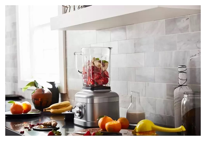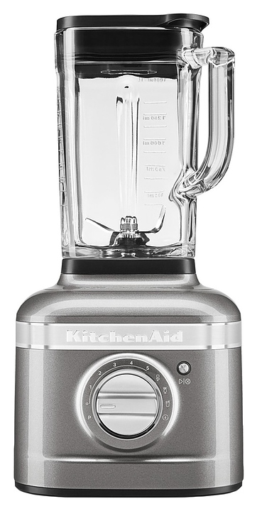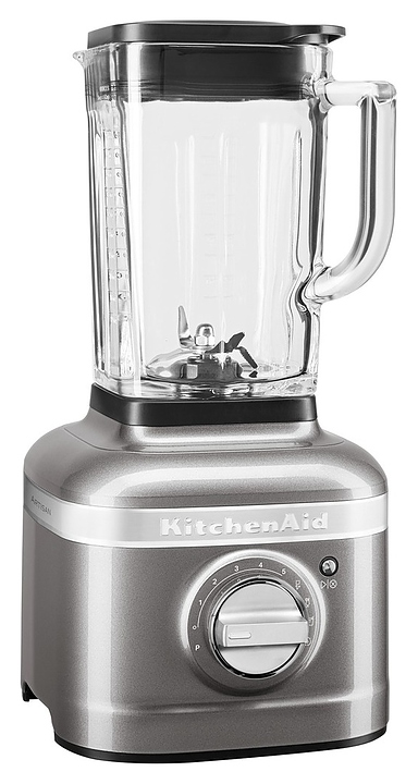 Стационарный блендер KitchenAid Artisan K400 5KSB4026EMS предназначен для измельчения пищевых продуктов и приготовления муссов, смузи, фраппе, соусов, коктейлей, фруктовых и овощных пюре в домашних условиях. Модель оснащена кабелем питания с вилкой и электромеханической панелью управления. Корпус квадратно ориентированной формы выполнен из металла методом литья под давлением с покрытием эмалью оттенка серебряный медальон (Medallion Silver) и декоративной серебристой полосой с логотипом по периметру верхней части, основание прибора и корпус ножевого узла – из черного пластика, кувшин – из стекла, крышки – из черного полимера, ножи – из высококачественной нержавеющей стали, переключатель с серебристой поверхностью.