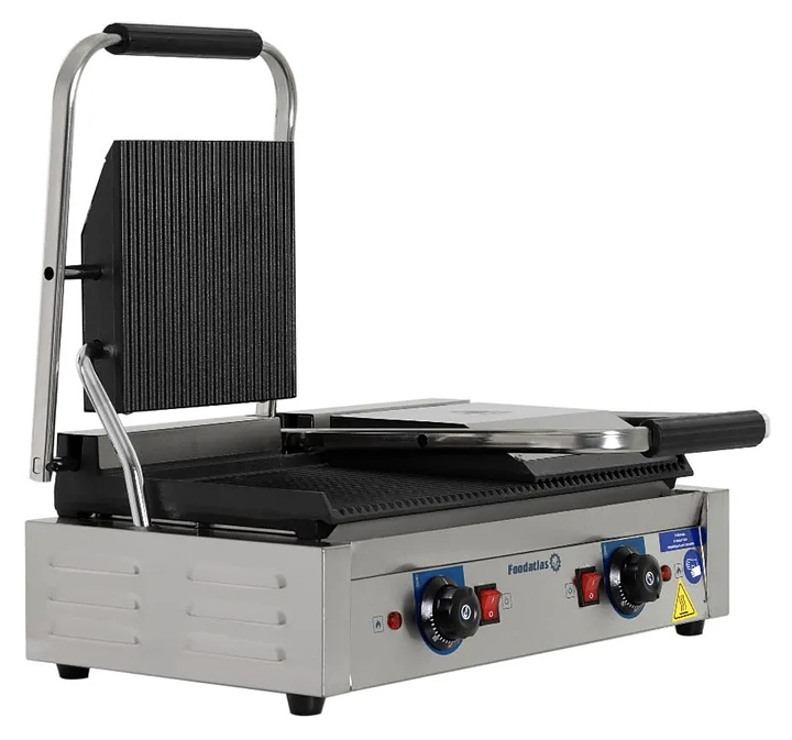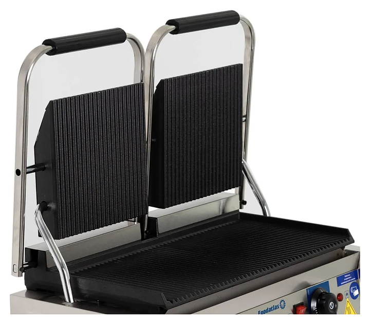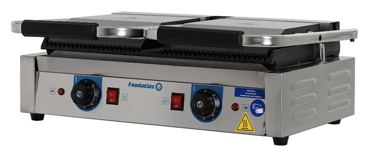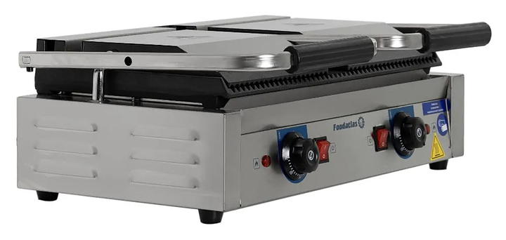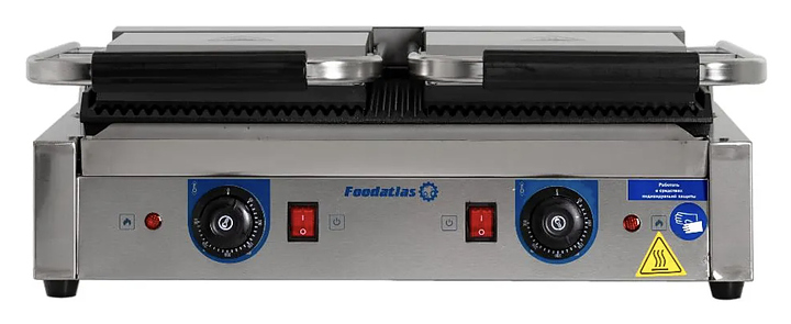 Пресс гриль контактный прижимной Foodatlas EG-813 предназначен для приготовления пищи (рыбы, мяса, овощей, морепродуктов, бутербродов) на жару на профессиональной кухне ресторанов, кафе, баров, торговых точек со стритфудом и фастфудом. Прибор оснащен двумя верхними и одной нижней нагревающимися поверхностями, открывающихся по принципу книжки, в нижней части предусмотрен поднос для сбора масла. На нижнюю часть кладутся продукты и прижимаются верхней частью. Модель изготовлена из высококачественной нержавеющей стали SUS304, которая отличается прочностью, долговечностью и безопасностью, не изменяет вкусовые качества, запах и цвет пищи, так как не вступает в реакцию с её компонентами. Упаковка пятислойный картон. Особенности: