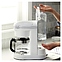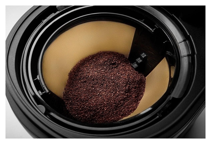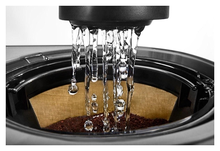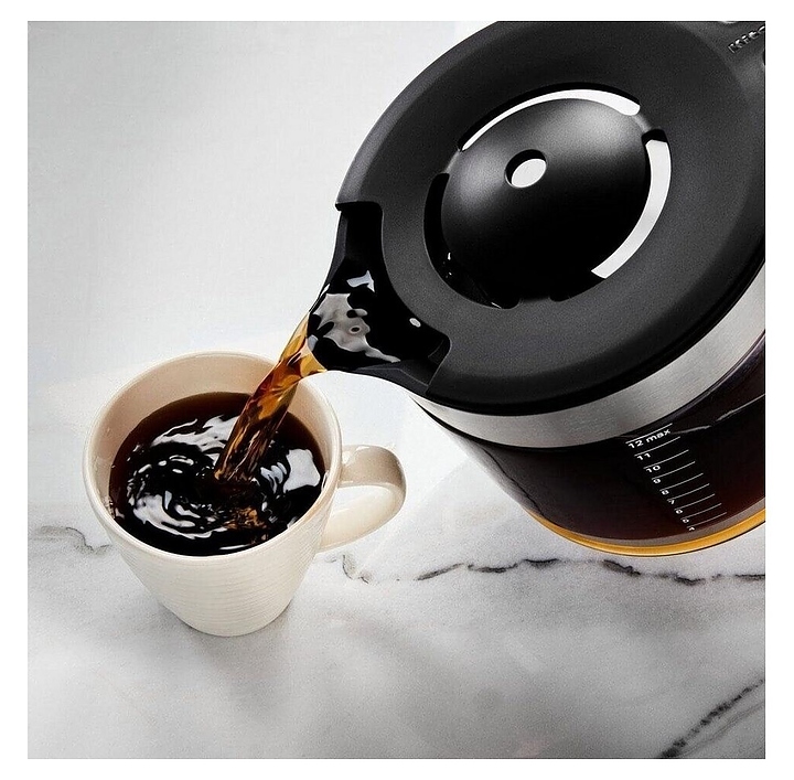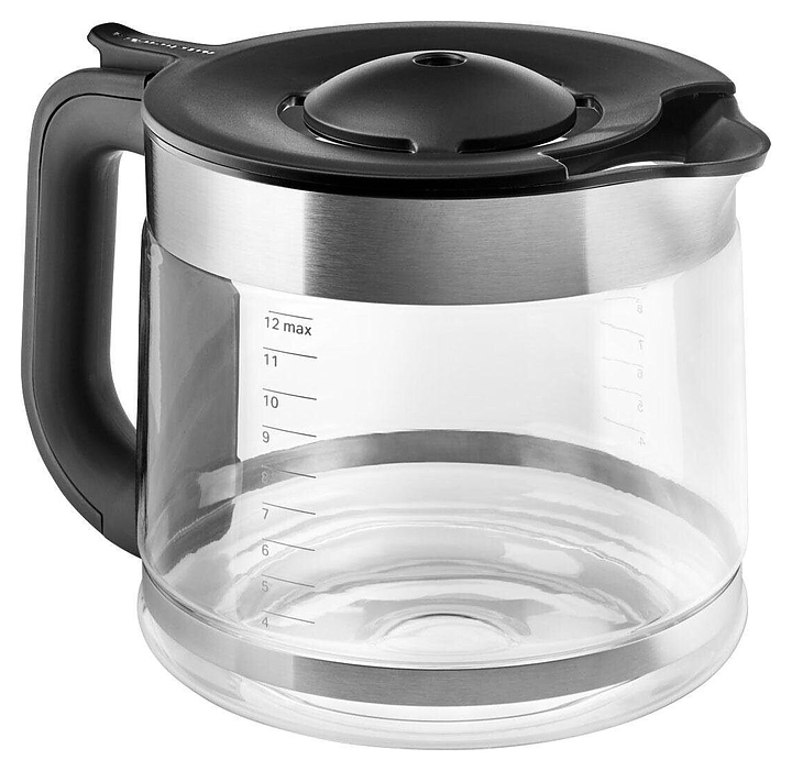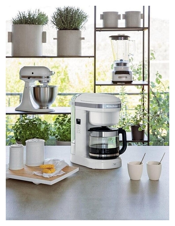 Капельная кофеварка KitchenAid Classic 5KCM1208EWH предназначена для приготовления кофе в гостиницах, офисах и домашних условиях. Модель оснащена откидными крышкой и распылительной головкой, резервуаром для фильтра, кабелем питания вилкой и расположенной на боковой стенке электронной панелью управления с нажимными функциональными клавишами, информативным жидкокристаллическим дисплеем с цифровыми и символьными сегментами с белой подсветкой индикации. Вертикально ориентированный корпус обтекаемой формы выполнен из ударопрочного пластика с поверхностью белого цвета и декорирован горизонтальной серебристой полосой с логатипом в верхней части, нагревательная пластина – из нержавеющей стали, резервуар для фильтра – из белого пластика, резервуар для воды – из прозрачного полимера, кувшин – из прозрачного стекла с серебристыми металлическими окантовками в верхней части и основании, рукоятка и крышка кувшина – из черного пластика с матовой поверхностью. Комплектация:
