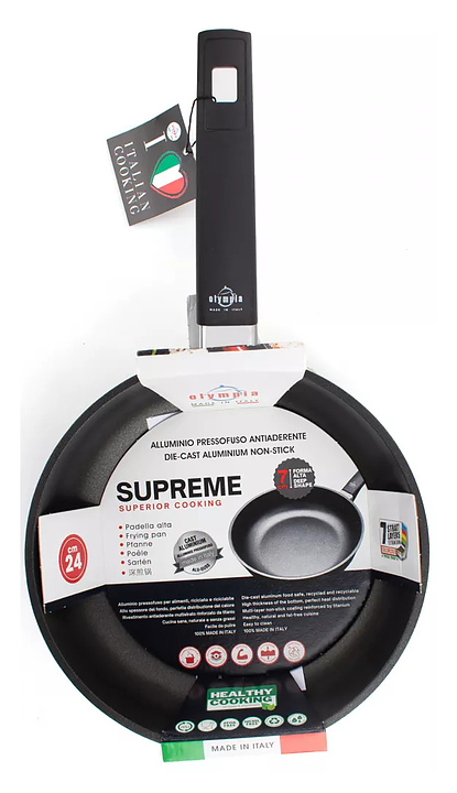 Сковорода Olympia Supreme 21.24 предназначена для приготовления широкого спектра блюд на любых типах варочных поверхностей, за исключением индукционных, на предприятиях общественного питания и торговли, а также в домашних условиях. Модель оснащена расширенным кверху бортом и рукояткой с отверстием для подвешивания. Изделие выполнено из литого алюминия с антипригарным покрытием. Особенности: