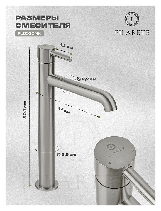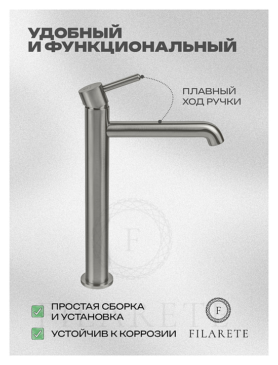 Смеситель для раковины высокий FILARETE Roun FL6020NK предназначен для использования в ванных помещениях для подачи горячей и холодной воды. Серия выполнена в современном стиле. Модель оснащена керамическим картриджем, обеспечивающим плавный ход рычага смесителя, контроль и точность при выборе напора и температуры воды, а также аэратором для создания мягкой ровной струи без разбрызгивания. Изделие выполнено из высококачественной латуни, отличающейся прочностью, долговечностью и устойчивостью к перепадам температур. Комплект поставки: