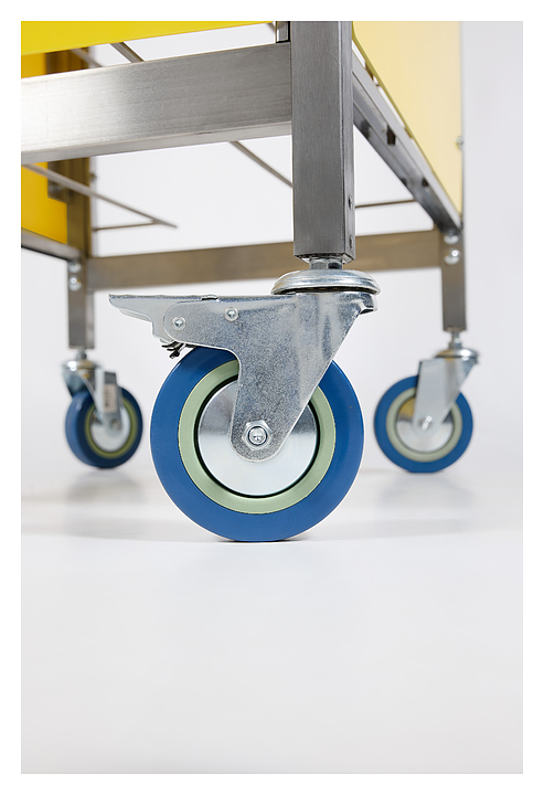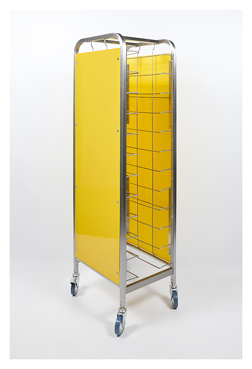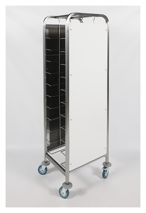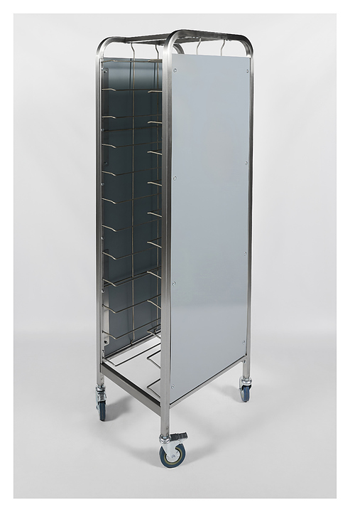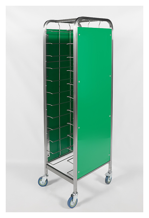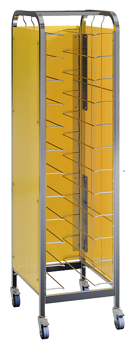 Тележка-шпилька Restoinox ТШРЗППР-12/360/540 предназначена для хранения и транспортировки подносов на предприятиях общественного питания и торговли. Модель оснащена 4 колесами, 2 из которых со стопорами. Разборный каркас выполнен из трубы 25х25 мм нержавеющей стали AISI 430, боковины - из цветного пластика. Особенности: