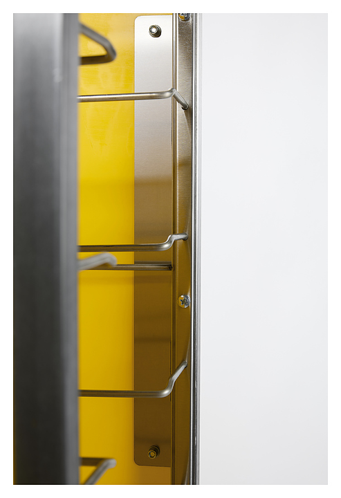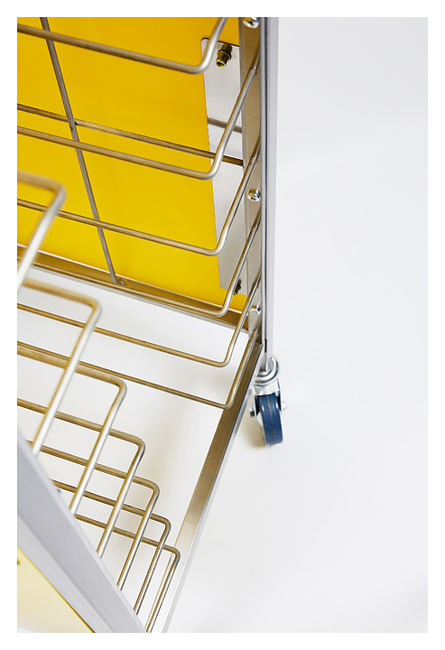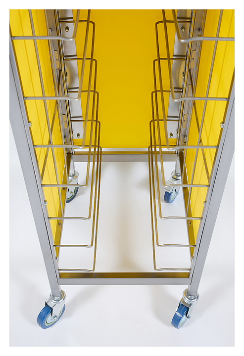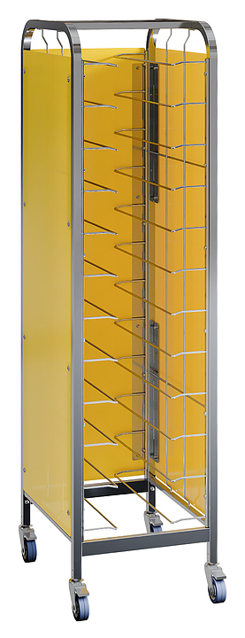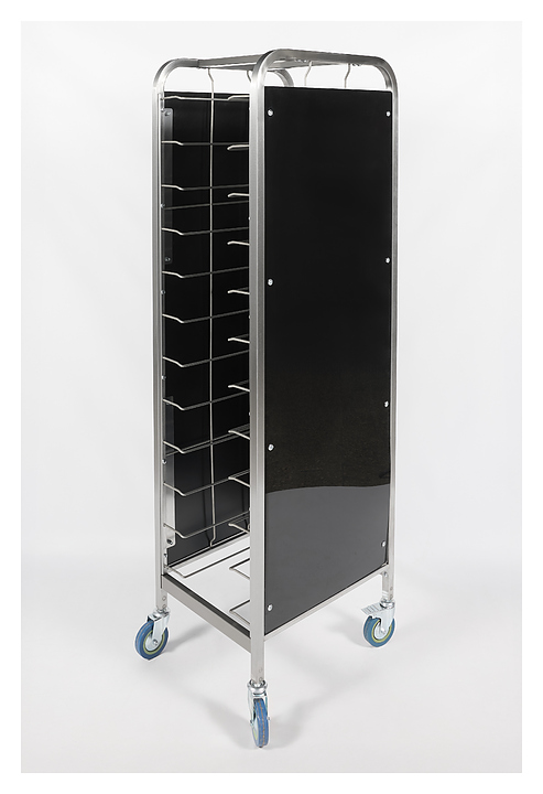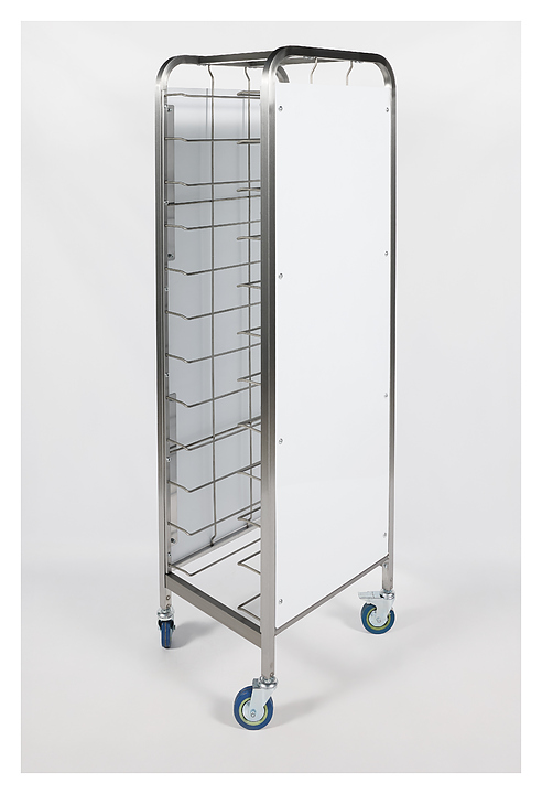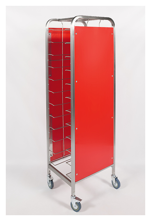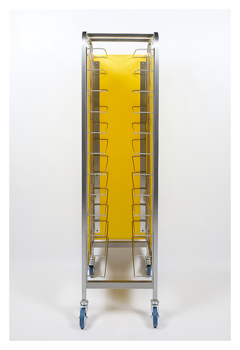 Тележка-шпилька Restoinox ТШРЗППРА-12/360/540 предназначена для хранения и транспортировки подносов на предприятиях общественного питания и торговли. Модель оснащена 4 колесами, 2 из которых со стопорами. Разборный каркас выполнен из трубы 25х25 мм нержавеющей стали AISI 430, боковины - из цветного алюкобонда. Дополнительные характеристики: