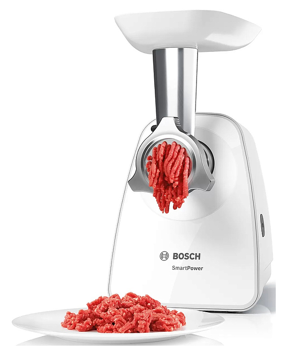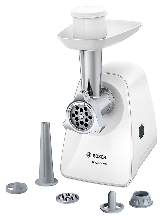Мясорубка Bosch MFW2520W серии SmartPower измельчает мясо и рыбу при производстве фарша и колбасок. Модель оснащена 4 насадками и мощным мотором. Универсальный толкатель обеспечивает равномерное прохождение продуктов через мясорубку. Прорезиненные ножки гарантируют безопасность при эксплуатации. Корпус и лоток выполнены из высококачественного пластика, который отличается долговечностью и надежностью при длительном использовании. Комплектация: