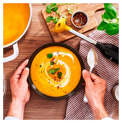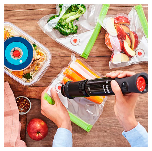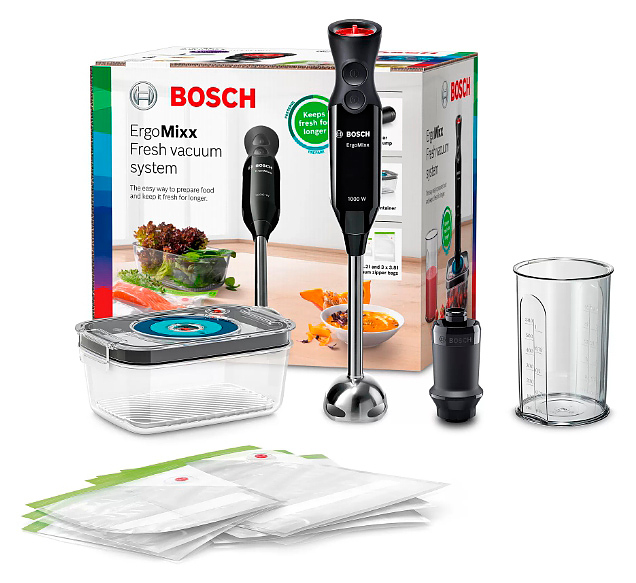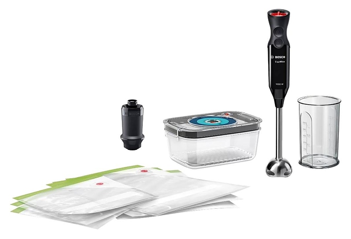 Вакуумный блендер Bosch MS6CB61V1 серии ErgoMixx предназначен для измельчения фруктов, овощей, орехов и трав, а также приготовления соусов, смузи и супов-пюре в домашних условиях. Модель оснащена ножом с 4 лезвиями QuattroBlade, эргономичной ручкой с мягким покрытием Soft-touch, кнопками и поворотным переключателем. Насос для вакуумирования и специальные контейнеры продлевают свежесть продуктов и срок хранения в 2 раза дольше, чем в обычных емкостях. Турбо-режим обеспечивает максимальную мощность за короткое время для быстрого измельчения твердых продуктов и приготовления однородных смесей, коктейлей и пюре. Съемные детали можно мыть в посудомоечной машине. Корпус выполнен из пластика, погружная часть - из нержавеющей стали. В комплект поставки входят мерный стакан, вакуумный насос, вакуумный контейнер и вакуумные пакеты с замком. Дополнительные характеристики: