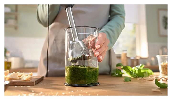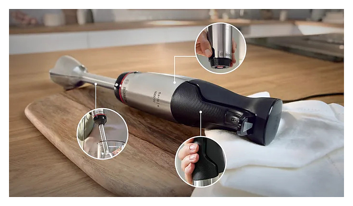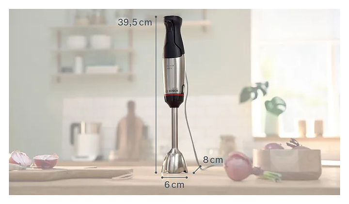 Погружной блендер Bosch MSM6M610 серии ErgoMixx предназначен для взбивания жидкого теста, кремов и коктейлей, измельчения фруктов, овощей, орехов и трав, а также приготовления соусов и супов-пюре в домашних условиях. Модель оснащена ножом с 4 лезвиями QuattroBlade, ручкой, кнопками и бесступенчатой регулировкой скорости. Турбо-режим обеспечивает максимальную мощность за короткое время для быстрого измельчения твердых продуктов и приготовления однородных смесей, коктейлей и пюре. Съемные детали можно мыть в посудомоечной машине. Корпус выполнен из нержавеющей стали и пластика, чаша измельчителя - из пластика. Дополнительные характеристики: