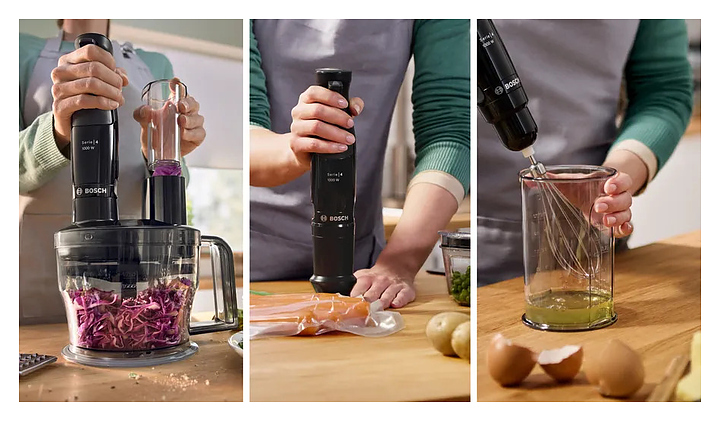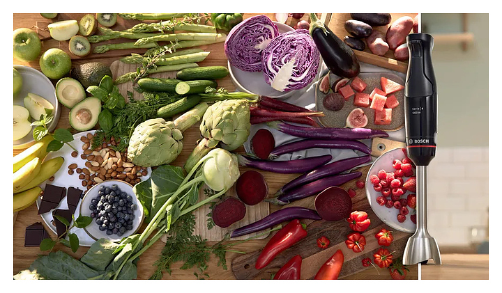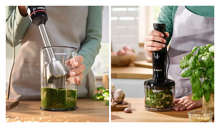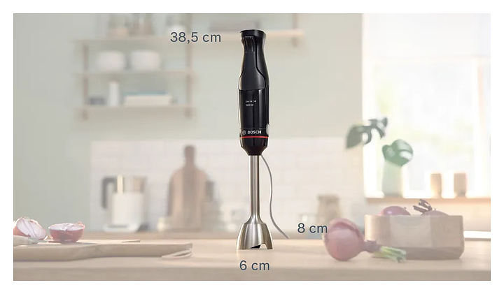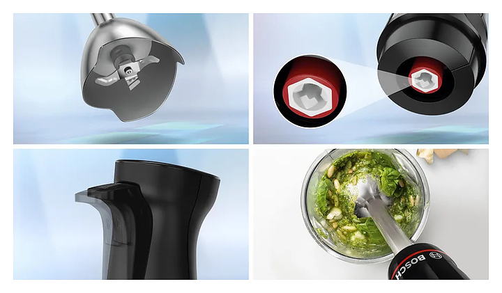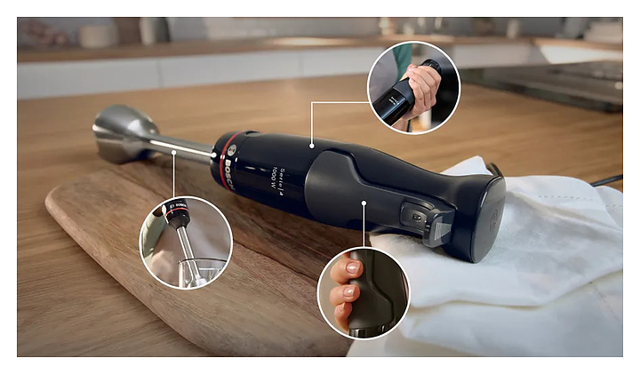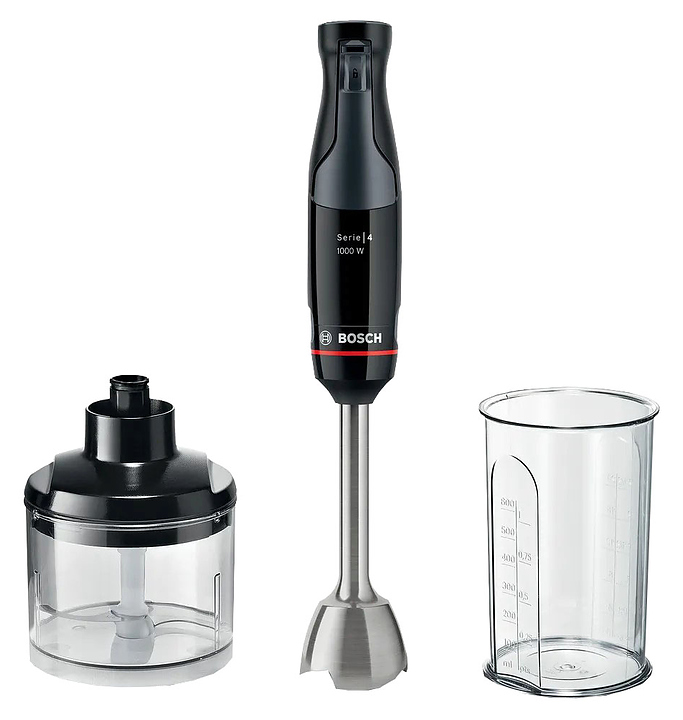 Погружной блендер Bosch MSM4B620 серии ErgoMaster предназначен для взбивания жидкого теста, кремов и коктейлей, измельчения фруктов, овощей, орехов и трав, а также приготовления соусов и супов-пюре в домашних условиях. Модель оснащена ножом с 4 лезвиями QuattroBlade, эргономичной ручкой, кнопками и бесступенчатой регулировкой скорости. Блендер обладает функциями насадки-комбайна для измельчения твердых продуктов. Съемные детали можно мыть в посудомоечной машине. Корпус и стакан из пластика, погружная часть - из нержавеющей стали. В комплект поставки входит мерный стакан. Дополнительные характеристики: