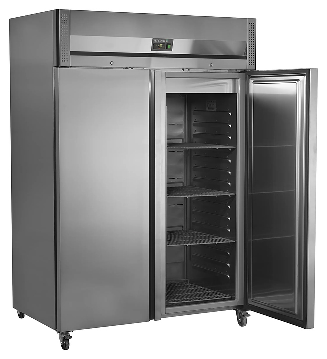 Морозильный шкаф TEFCOLD RF1420X1 предназначен для длительного хранения и заморозки продуктов, полуфабрикатов и мороженого на предприятиях общественного питания и торговли. Модель оснащена 2 распашными глухими дверьми, 6 регулируемыми полками, 4 колесами, замком, термометром и электронным контроллером с возможностью подключения Bluetooth и NFC. Корпус выполнен из нержавеющей стали SS 304, полки - из проволоки. Особенности: