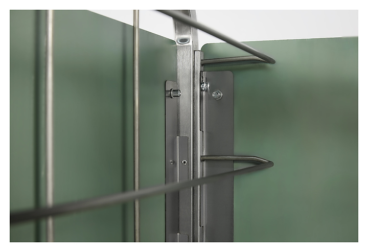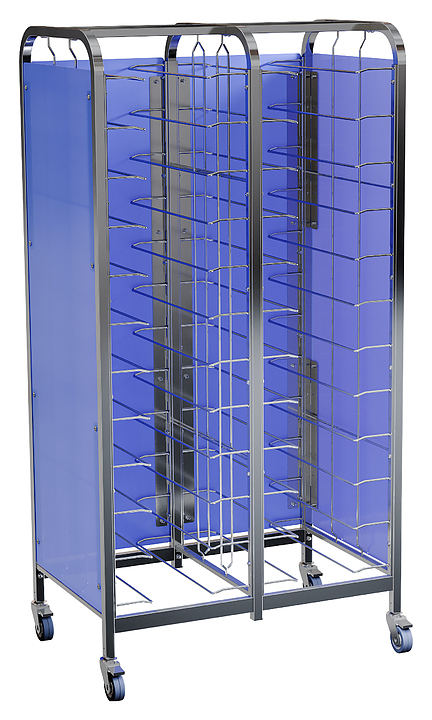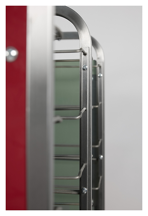Тележка-шпилька Restoinox ТШРЗППРА-12х2/360/540 предназначена для хранения и транспортировки подносов на предприятиях общественного питания и торговли. Модель оснащена 2 рядами по 12 уровней направляющих. Каркас выполнен из профиля квадратного сечения из нержавеющей стали марки AISI 430, направляющие – из прутка из нержавеющей стали марки AISI 304, панели – из алюкобонда. Особенности: