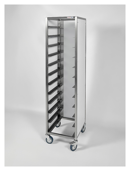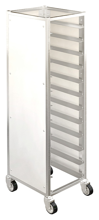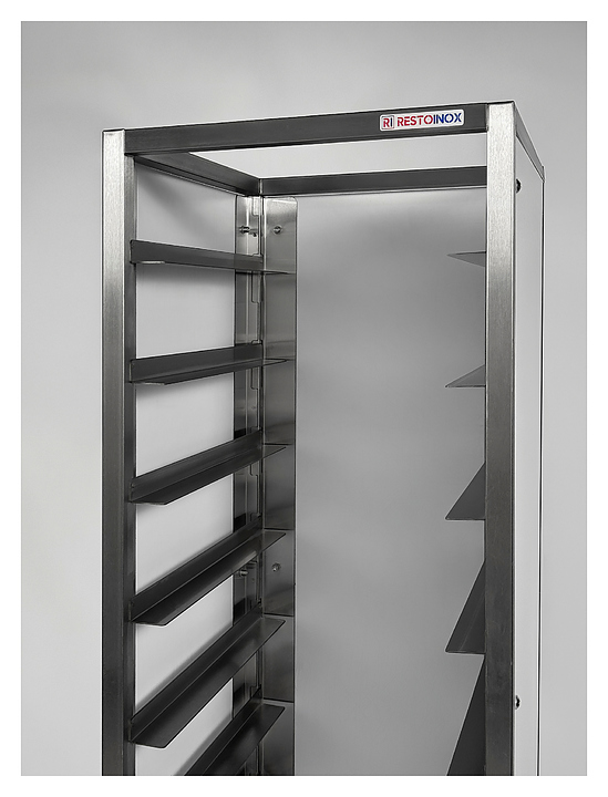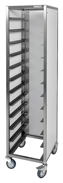 Тележка-шпилька Restoinox ТШСЗПП-12-40/20-304/325-360 предназначена для хранения и транспортировки подносов на предприятиях общественного питания и торговли. Модель оснащена рядом с 12 уровнями направляющих. Каркас выполнен из профиля прямоугольного сечения из нержавеющей стали марки AISI 304, направляющие – из углового профиля из нержавеющей стали марки AISI 304, панели – из пластика. Особенности: