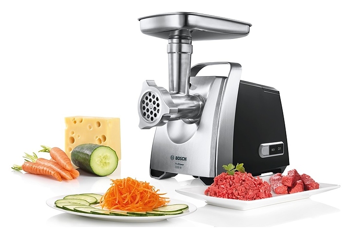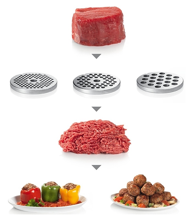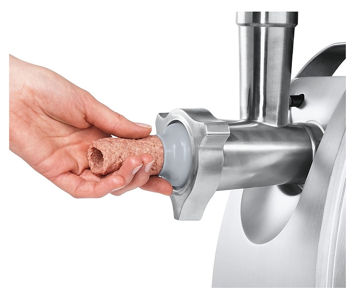 Мясорубка Bosch MFW 68680 измельчает мясо и рыбу при производстве фарша, формирует колбаски и кеббе, шинкует овощи, натирает сыр, измельчает орехи и отжимает сок. Модель оснащена отсеком для хранения формовочных дисков и резиновыми ножками. Комплектация: