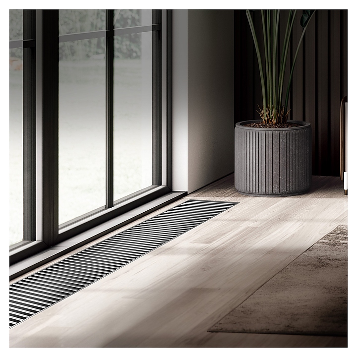 Конвектор Royal Thermo ATRIUM-75/200/2000-DG-U-NA предназначен для обогрева и поддержания комфортного микроклимата в жилых и служебных помещениях. Модель оснащена съемным пластинчато-трубным водяным теплообменником с резьбовыми соединительными патрубками: нагрев воздуха осуществляется путем циркуляции подаваемого в трубный контур теплоносителя, дальнейшей передачи тепла на оребрение и естественной конвекции. Корпус прямоугольного сечения выполнен из оцинкованной стали, трубы теплообменника – из меди, оребрение теплообменника – из алюминия, патрубки теплообменника – из латуни, ламели решетки – из алюминия с анодированной поверхностью оттенка натуральный алюминий, корпус и теплобменник с покрытием шагреневой краской AkzoNobel черного цвета Noir Sable.