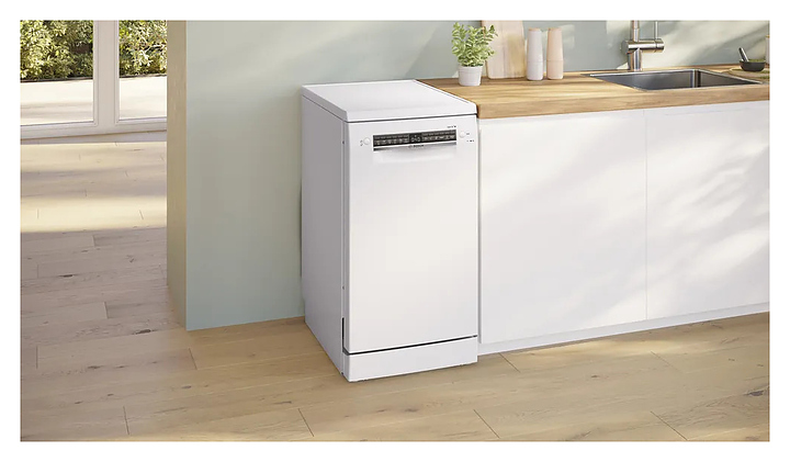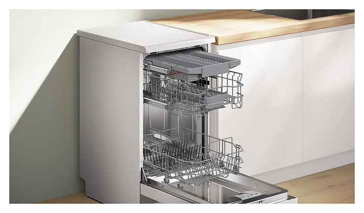 Посудомоечная машина Bosch SPS4HMW64Q серии 4 предназначена для гигиенической обработки и последующей сушки различной посуды в гостиничных комплексах и домашних условиях. Модель оснащена распылительными коромыслами, узлом фильтров, дозатором моющих и ополаскивающих средств, резервуаром для соли, кабелем питания с вилкой, откидной дверью, расположенной на фасаде двери электронной панелью управления с нажимными функциональными клавишами, светодиодными индикаторами и цифровым дисплеем с белой подсветкой индикации. Корпус выполнен из стали с покрытием белого цвета, внутренняя облицовка камеры и двери – из высококачественной нержавеющей стали, прочие внутренние компоненты – из экологически безопасного термостойкого пластика, панель управления черного цвета. Комплектация: