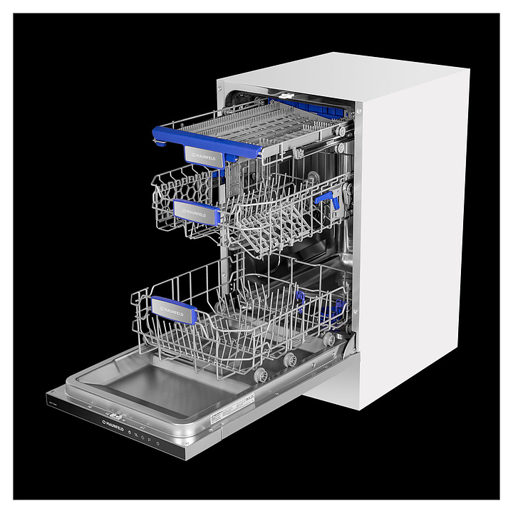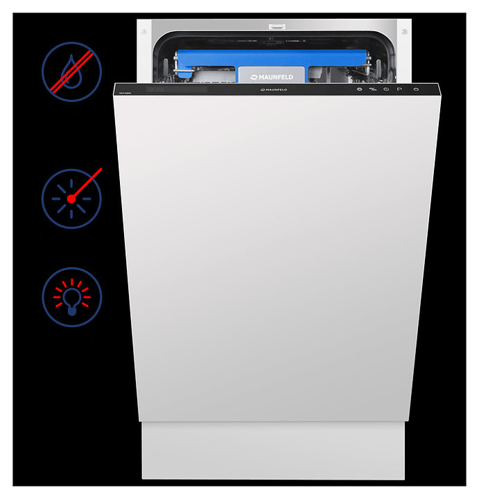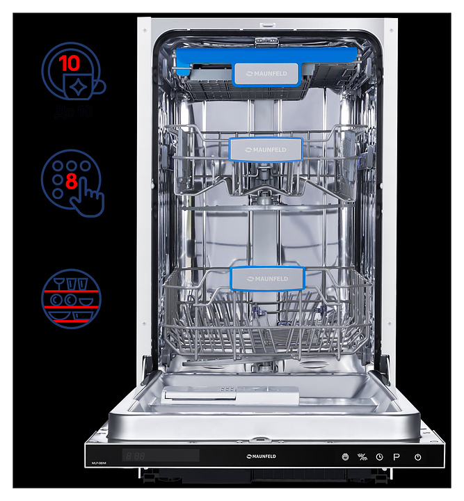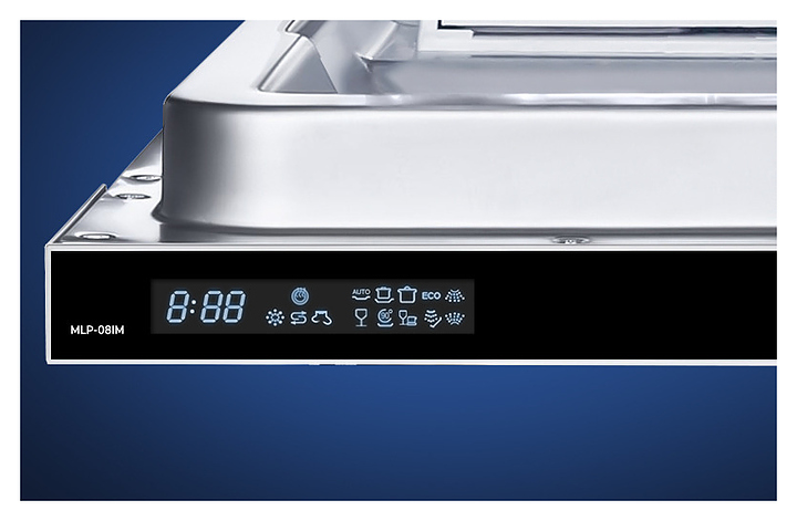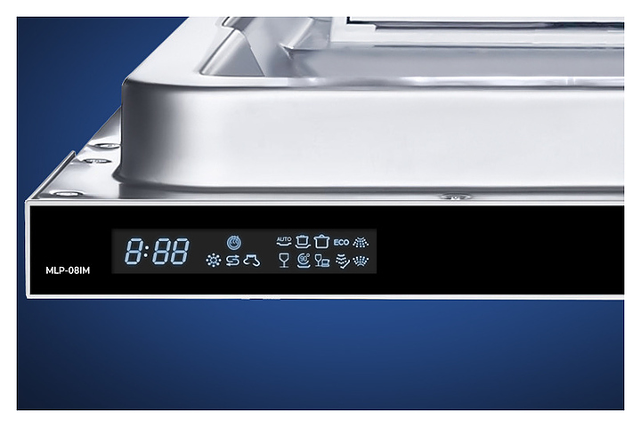 Встраиваемая посудомоечная машина Maunfeld MLP-08IM предназначена для гигиенической обработки и последующей сушки различной посуды в гостиничных комплексах и домашних условиях. Модель оснащена камерой с откидной дверью с интегрированной рукояткой, верхним и нижним моечными рукавами, дозаторами моющих и ополаскивающих средств, устройством умягчения воды, кабелем питания с вилкой, расположенной на верхнем торце двери панелью управления с функциональными сенсорными клавишами, светодиодным дисплеем с цифровыми и символьными сегментами с белой подсветкой индикации. Внутренняя облицовка камеры и двери выполнена из высококачественной нержавеющей стали марок AISI304 и AISI430, корпус – из металла с антикоррозийным покрытием, панель управления – из полимера черного цвета.