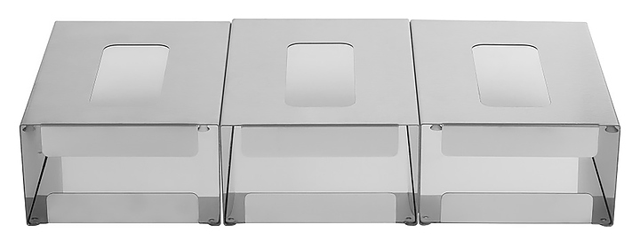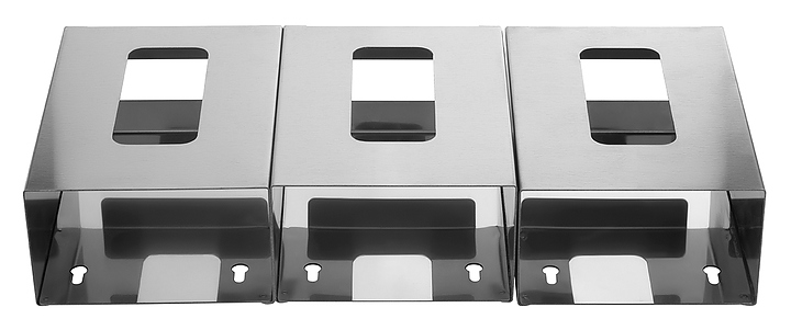 Тройной диспенсер ЦПО D-003 предназначен для хранения и выдачи одноразовых перчаток в больницах, клиниках, стоматологических кабинетах, поликлиниках, лабораториях, на предприятиях пищевой промышленности и в учебных заведениях. Дозатор позволяет разместить 3 коробки с перчатками разных размеров. Диспенсер монтируется на стену или на специальную подставку. Корпус выполнен из пищевой нержавеющей стали AISI 430. В комплект поставки входят 2 самореза и 2 дюбеля. Дополнительные характеристики: