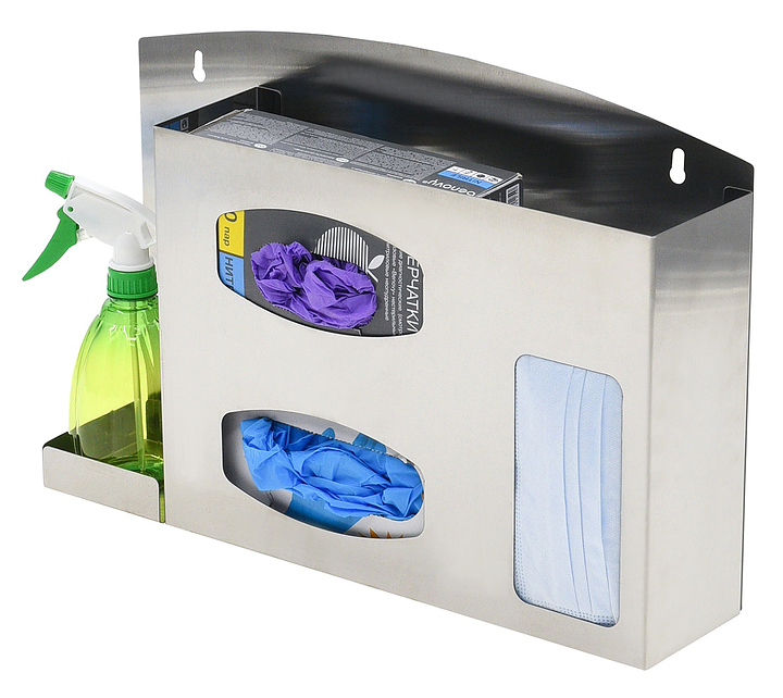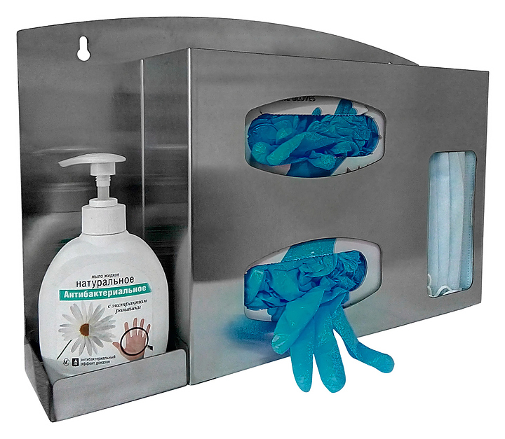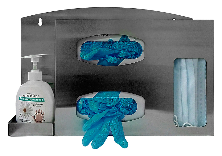Диспенсер ЦПО DU-001 предназначен для хранения и выдачи масок и одноразовых перчаток двух размеров в больницах, клиниках, стоматологических кабинетах, поликлиниках, лабораториях, на предприятиях пищевой промышленности и в учебных заведениях. Дозатор позволяет размещать средства индивидуальной защиты в коробках. Модель оснащена местом для емкости под антисептик, жидкое мыло или гель. Диспенсер монтируется на стену или на специальную подставку. Корпус выполнен из пищевой нержавеющей стали AISI 430. В комплект поставки входят 2 самореза и 2 дюбеля. Дополнительные характеристики: