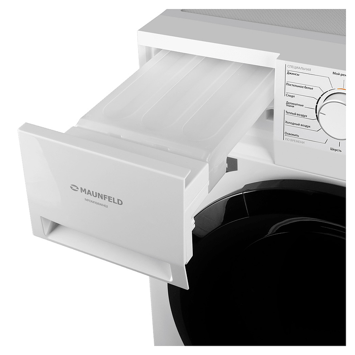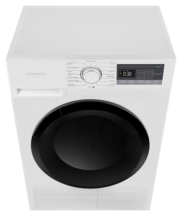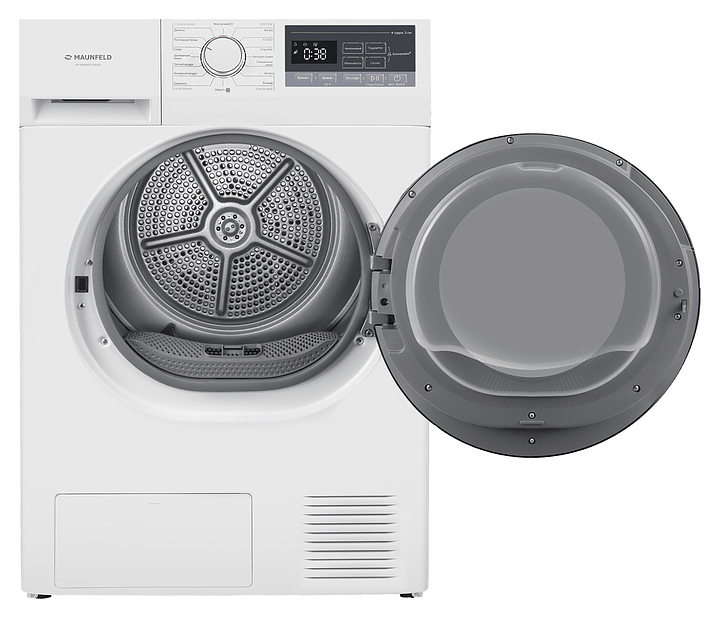 Автоматическая сушильная машина Maunfeld MFDM168WH02 используется в домашних условиях, а также небольших прачечных для сушки одежды, белья и тканей после стирки. Модель оснащена фронтальным загрузочным люком с правосторонней дверью со смотровым окном, тепловым насосом, кабелем питания с вилкой, электромеханической панелью управления с поворотным переключателем программ, нажимными функциональными клавишами, светодиодными сигнальными лампами и цифровым дисплеем с белой подсветкой индикации. Корпус выполнен из металла с антикоррозийным покрытием белого цвета, внешняя крышка двери люка – из стекла с полупрозрачной дымчатой тонировкой и черной окантовкой, барабан – из высококачественной нержавеющей стали, панель управления с поверхностью в серых тонах, переключатель белого цвета с серебристой окантовкой.