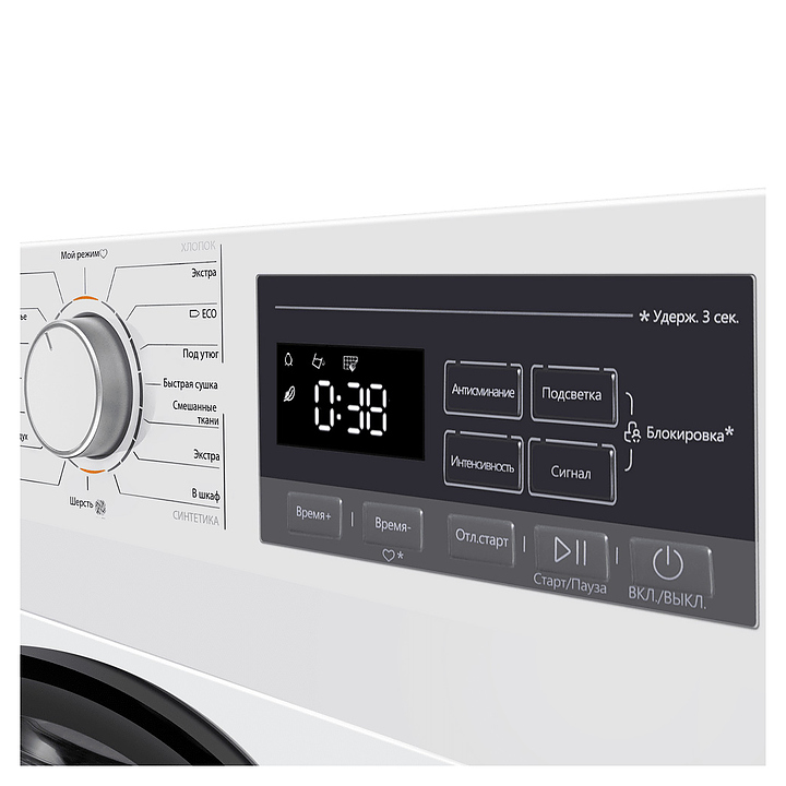 Индикация выбранной программы, заданных параметров, этапов процесса, активных функций, напоминания об опорожнении контейнера для кондесата и очистки основного фильтра