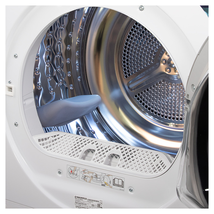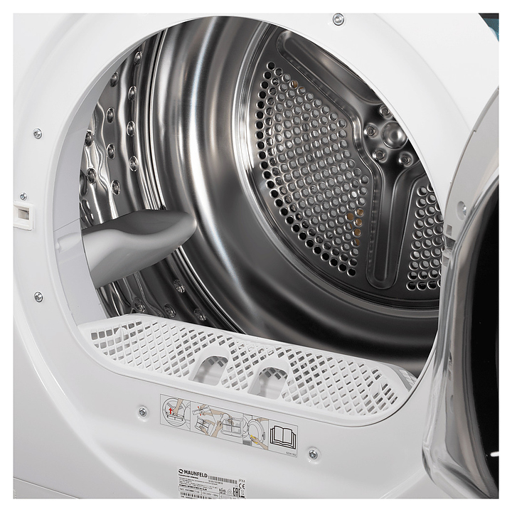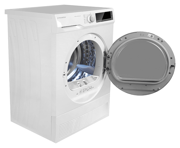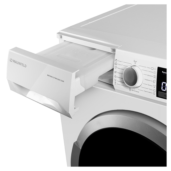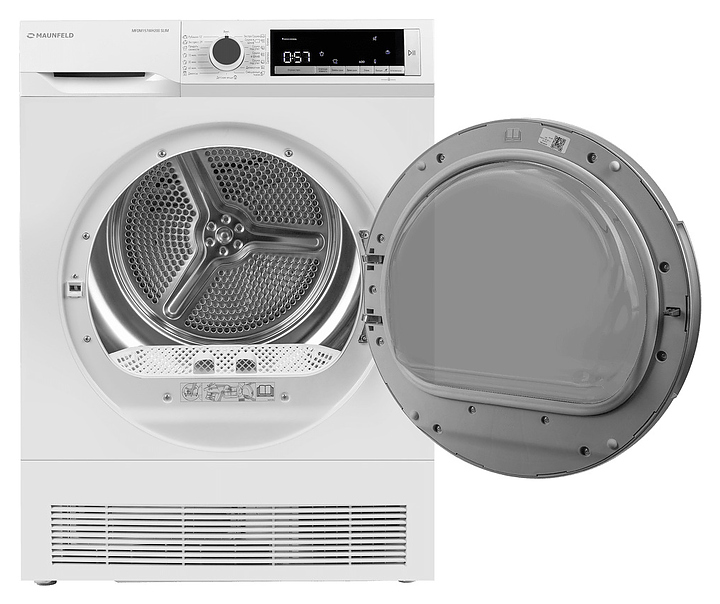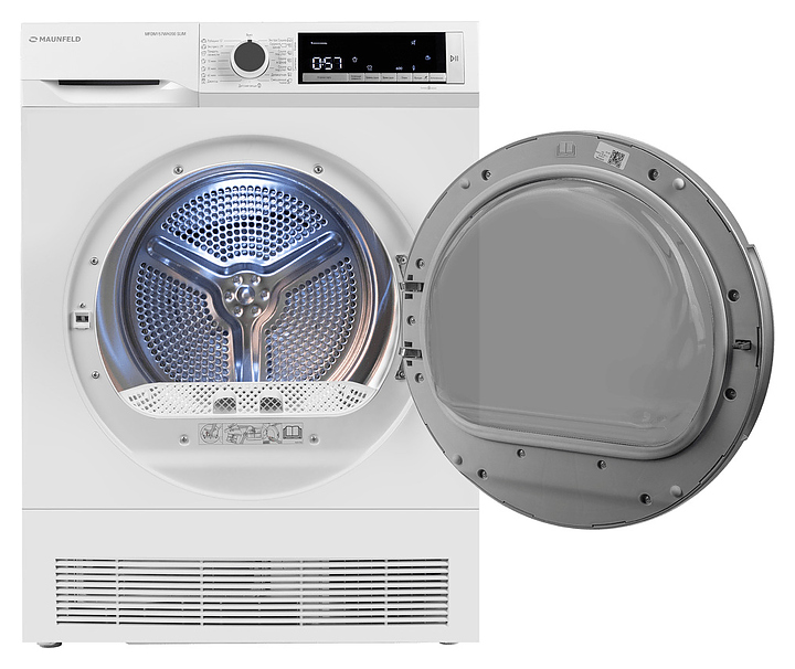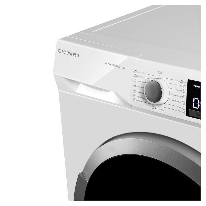 Автоматическая сушильная машина Maunfeld MFDM157WH200 SLIM используется в домашних условиях, а также небольших прачечных для сушки одежды, белья и тканей после стирки. Модель оснащена фронтальным загрузочным люком с правосторонней дверью со смотровым окном, кабелем питания с вилкой, электромеханической панелью управления с поворотным переключателем программ, нажимными функциональными клавишами, светодиодными сигнальными лампами и цифровым дисплеем с белой подсветкой индикации. Корпус выполнен из металла с антикоррозийным покрытием белого цвета, внешняя крышка двери люка – из стекла с полупрозрачной дымчатой тонировкой и окантовкой серебристого оттенка, барабан – из высококачественной нержавеющей стали, панель управления с глянцевой поверхностью черного цвета, переключатель и клавиши с серебристой поверхностью.