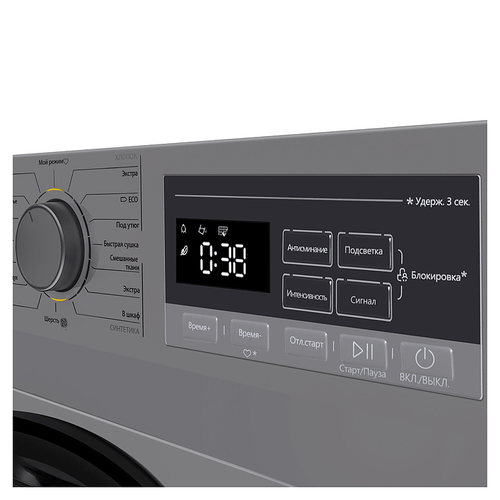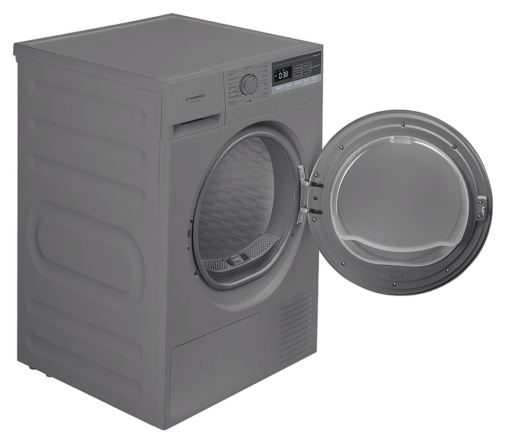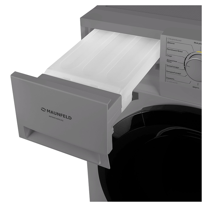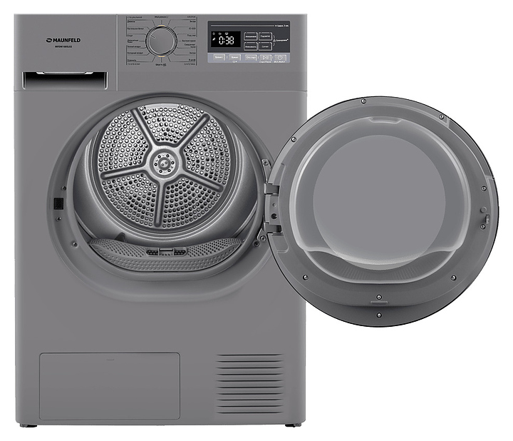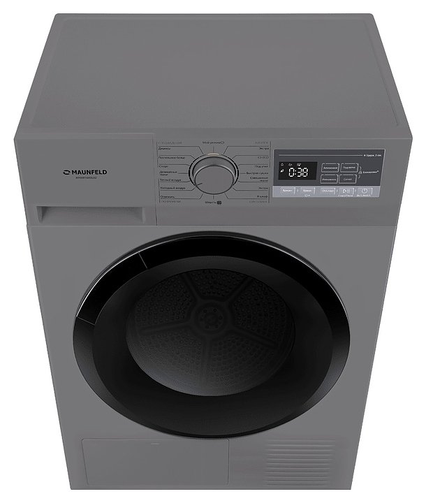 Автоматическая сушильная машина Maunfeld MFDM168SL02 используется в домашних условиях, а также небольших прачечных для сушки одежды, белья и тканей после стирки. Модель оснащена фронтальным загрузочным люком с правосторонней дверью со смотровым окном, тепловым насосом, кабелем питания с вилкой, электромеханической панелью управления с поворотным переключателем программ, нажимными функциональными клавишами, светодиодными сигнальными лампами и цифровым дисплеем с белой подсветкой индикации. Корпус выполнен из металла с антикоррозийным покрытием цвета нержавеющей стали, внешняя крышка двери люка – из стекла с полупрозрачной дымчатой тонировкой и черной окантовкой, барабан – из высококачественной нержавеющей стали, панель управления с поверхностью в серых тонах, переключатель с серебристой окантовкой.
