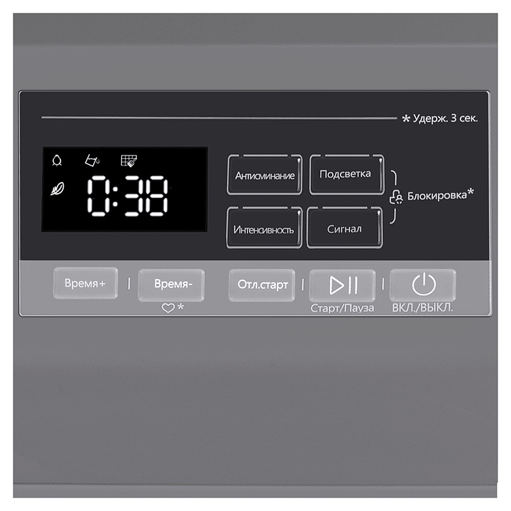 Индикация выбранной программы, заданных параметров, этапов процесса, активных функций, напоминания об опорожнении контейнера для кондесата и очистки основного фильтра